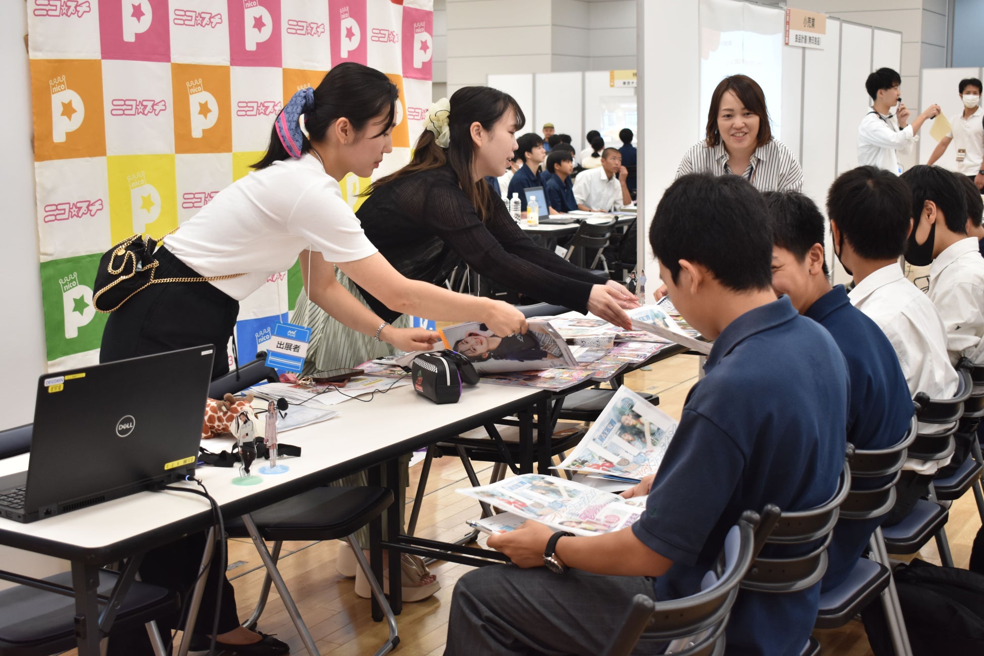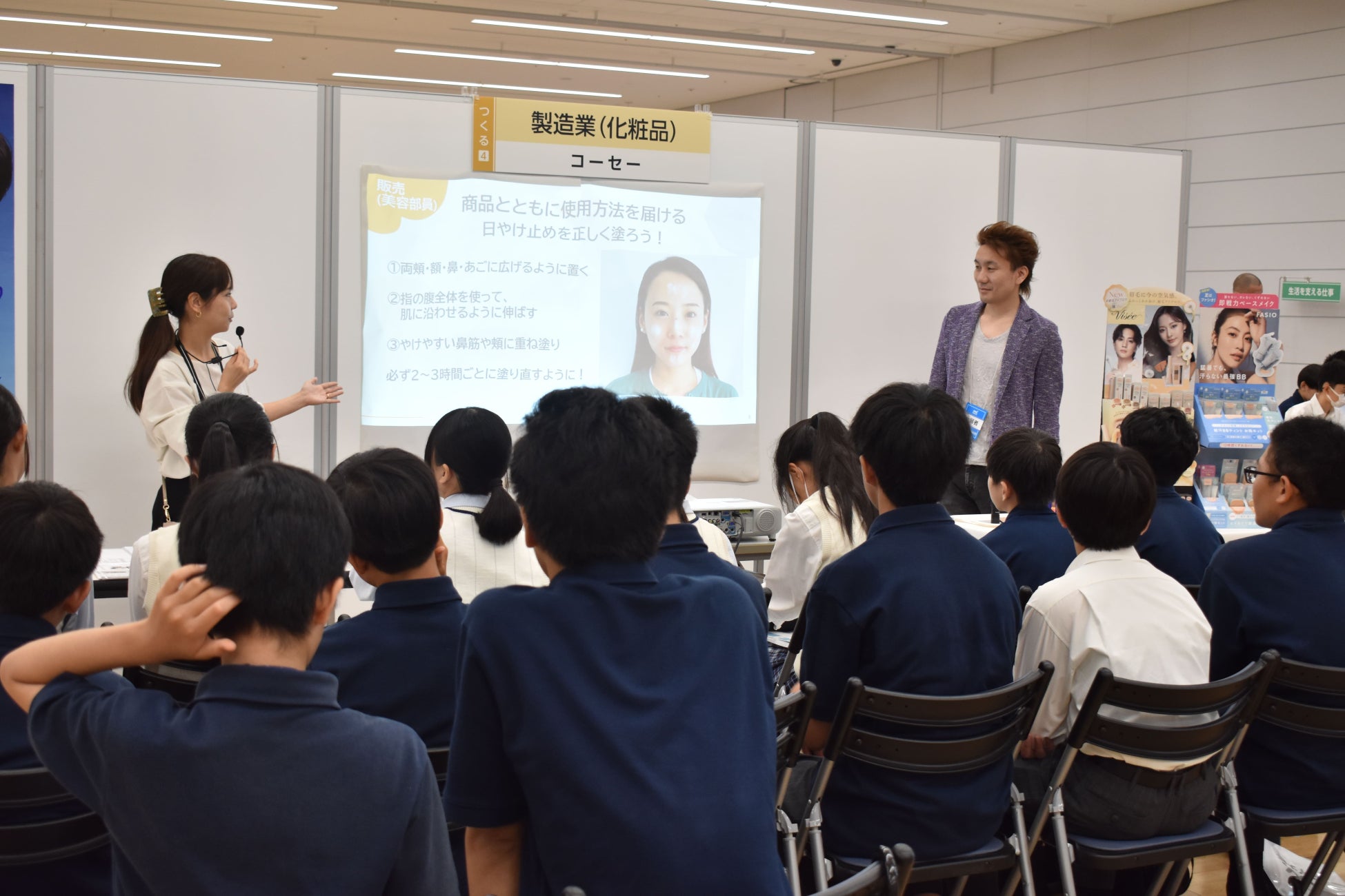 新潮社のブースでは「ラフを描いてみる」「キャッチを考えてみる」といった雑誌編集の仕事の一部を体験できたほか、コーセーのブースでは、商品とともに正しい使用方法を届ける美容部員の仕事の一例として、「日焼け止めの正しい塗り方」を学ぶ講義が行われていました。