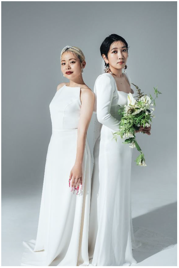 はるさんは自身のドレス姿に「あんなに胸元がざっくり開いているのは初めて着ました。自然と背筋も伸びて、自分に自信がついた感じがしました。ドレスのパワーってすごいですね。別人になったみたいな、『これ自分なんや』っていううれしさもありました」と語ってくれました。荒川さんについては「かわいさも残しつつ、格好良さも両方があるのがいいなって思いました。普段荒川さんが『ギャルメイクとカラコンがないと人前に出たくない』と言っているのも知っているけど、『全然いいやん!』ってくらいきれいだった。初めてこんな荒川を見ました」と大絶賛でした。