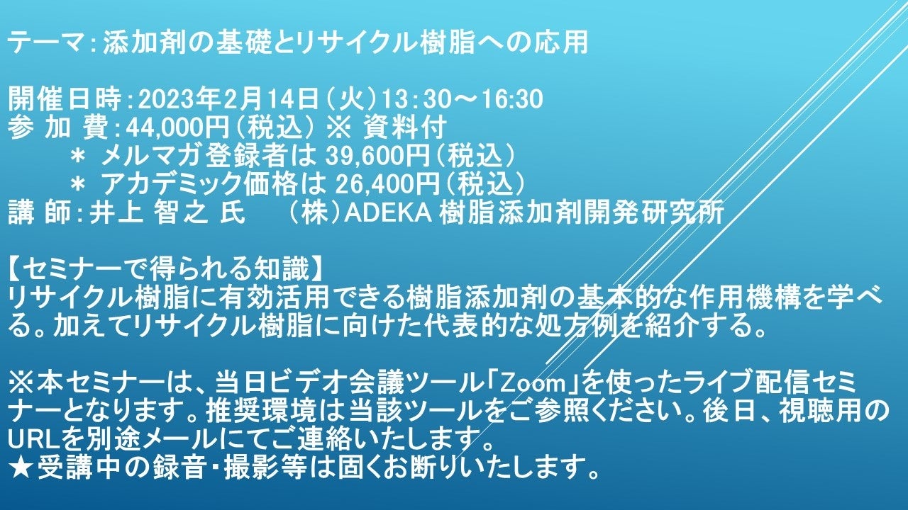 先端技術情報や市場情報を提供している(株)シーエムシー・リサーチ(千代田区神田錦町: https://cmcre.com/ )では、 各種材料・化学品などの市場動向・技術動向のセミナーや書籍発行を行っておりますが、 このたび「添加剤の基礎とリサイクル樹脂への応用」と題するセミナーを、 講師に井上 智之 氏 (株)ADEKA 樹脂添加剤開発研究所)をお迎えし、2023年2月14日(火)13:30より、 ZOOMを利用したライブ配信で開催いたします。 受講料は、 一般:44,000円(税込)、 弊社メルマガ会員:39,600円(税込)、 アカデミック価格は26,400円(税込)となっております(資料付)。