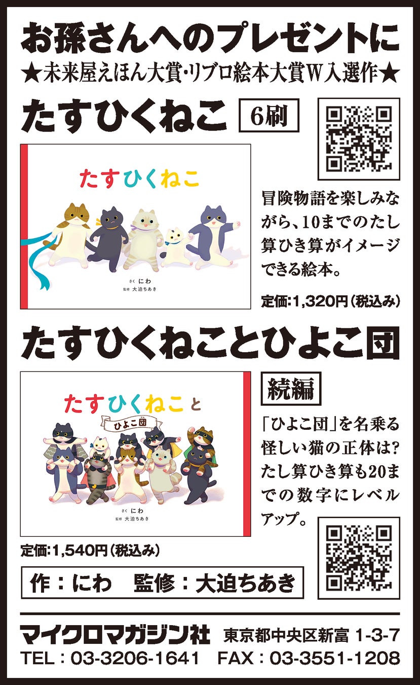 未来屋えほん大賞・リブロ絵本大賞にW入選「楽しく数が学べる」「自然と算数が身につく!?」と大人気!絵本『たすひくねこ』と続編『たすひくねことひよこ団』を5月15日(木)の朝日新聞に掲載いたしました。