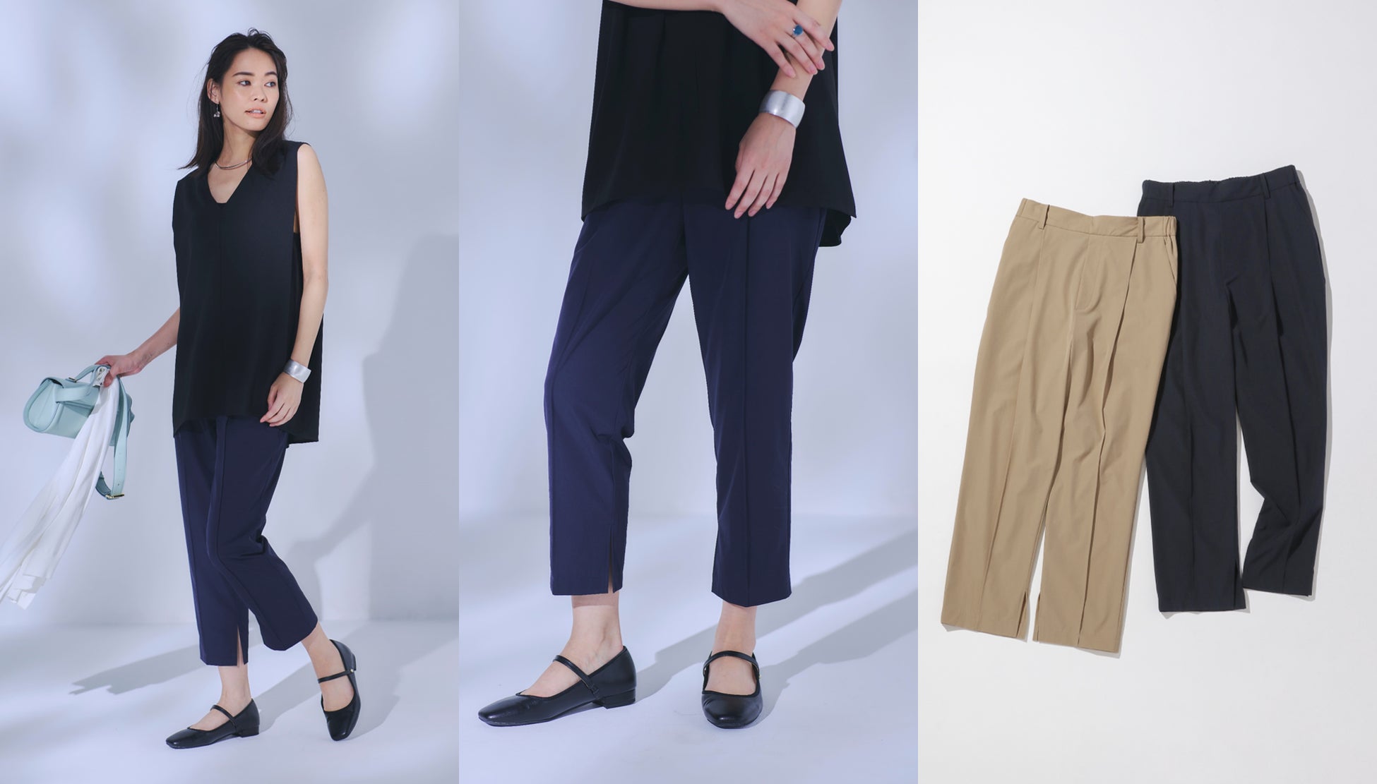 雨の日もスタイリングを上品にまとめてくれる優秀パンツ。