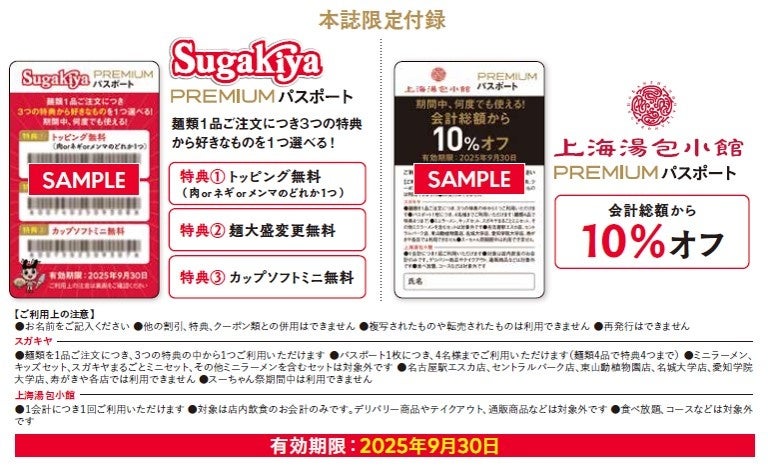 第2弾となる今回は、来年の創業80周年を控え、リニューアルしたグランドメニューや復刻メニュー、新業態の“たこ焼き専門店”“鍋焼きうどん”や、それらにまつわる秘話などをご紹介。スガキヤフリークのインタビューまで入った盛りだくさんの内容と、さらに本誌限定付録として来店時に何度でも使用可能なお得な「SPECIALパスポート」が付いた、スガキヤファンの心をくすぐる一冊です。