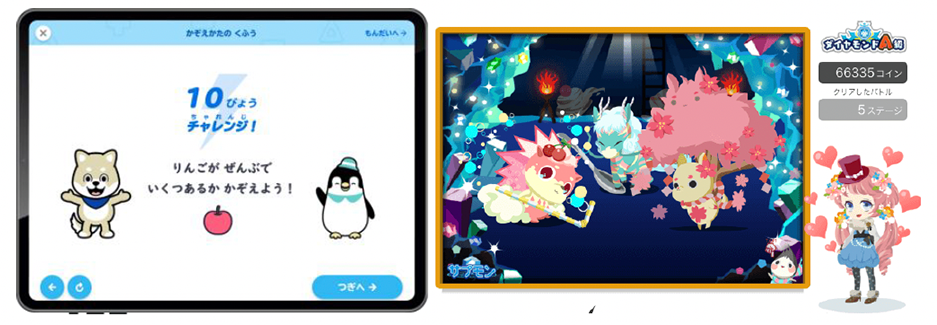 受動的に動画を視聴するだけでなく、能動的に回答をアウトプットしながら、アニメーションを視聴することで、飽きずにコンテンツに取り組めます。また、学習した分だけコインが獲得できコインを活用しバトルなどに利用できる「サプモン」も引き続き活用いただけます。子どもが、飽きずに楽しみながら学びやすいようゲーム感覚で楽しめるコンテンツを用意しています。