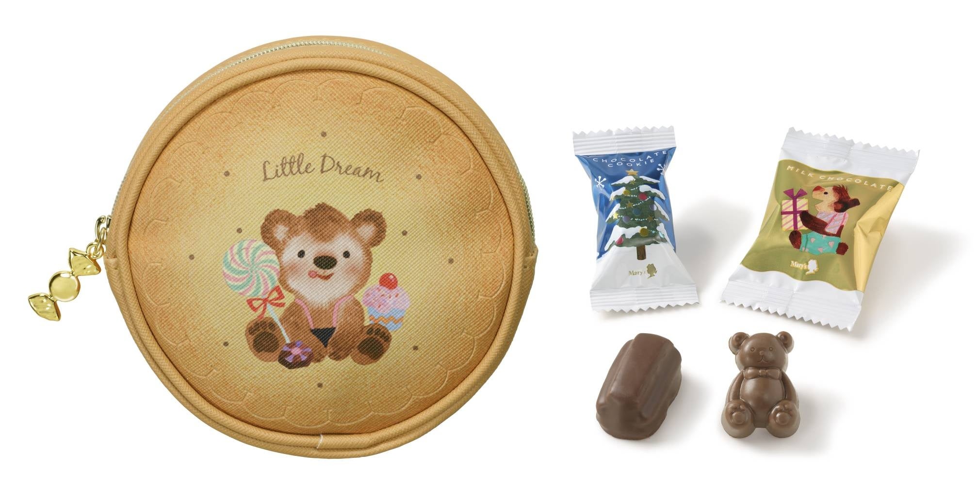 かわいらしいベアが描かれたビスケットの形のポーチに、チョコレートクッキーとベア型のチョコレートを詰め合わせました。ポーチにはキャンディ型のチャーム付き。