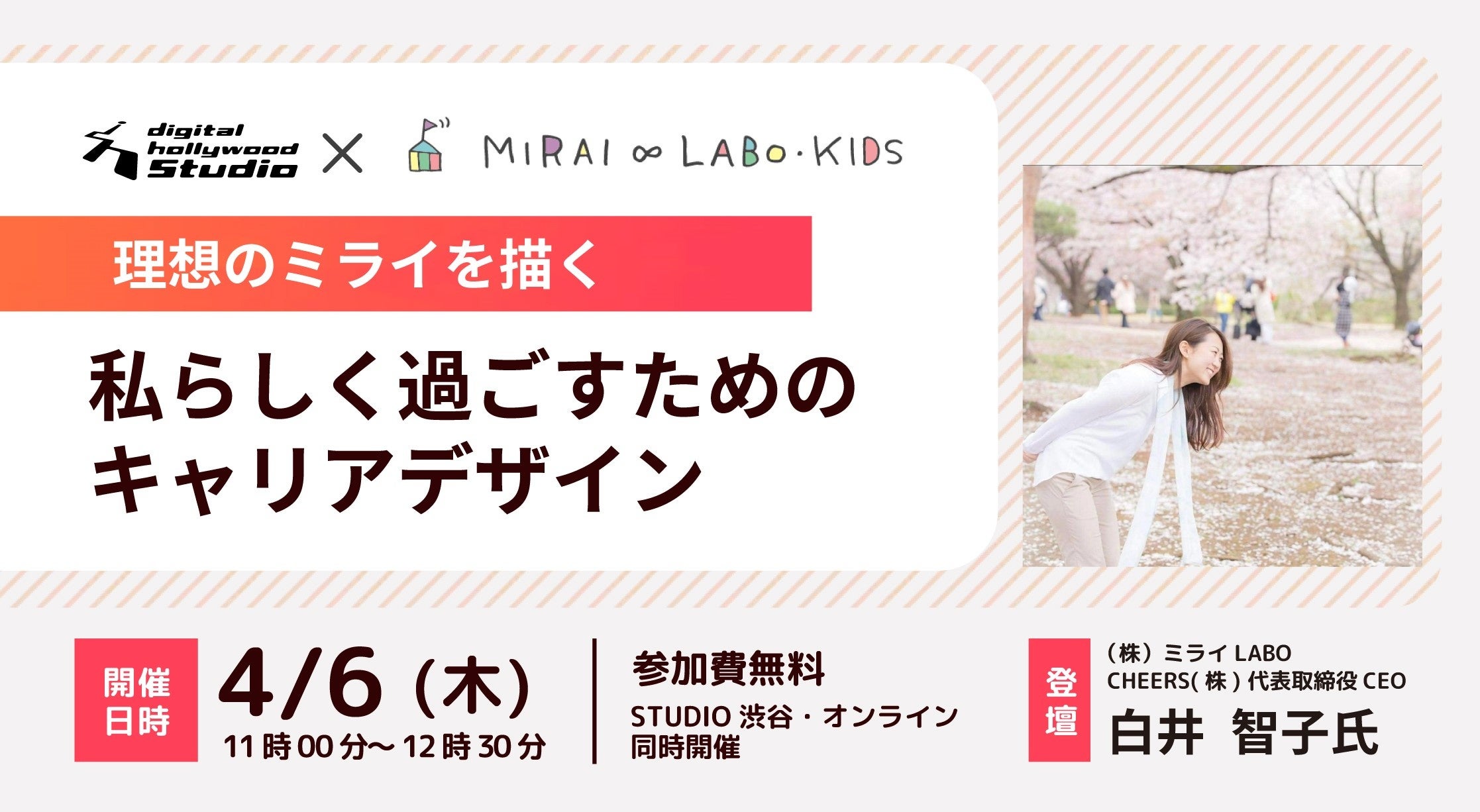 今回、育児と仕事の両立を叶える為にWeb業界を目指す方を対象に、株式会社ミライLABOより白井智子氏をお招きした特別セミナーをデジタルハリウッドSTUDIO渋谷で開催します。
