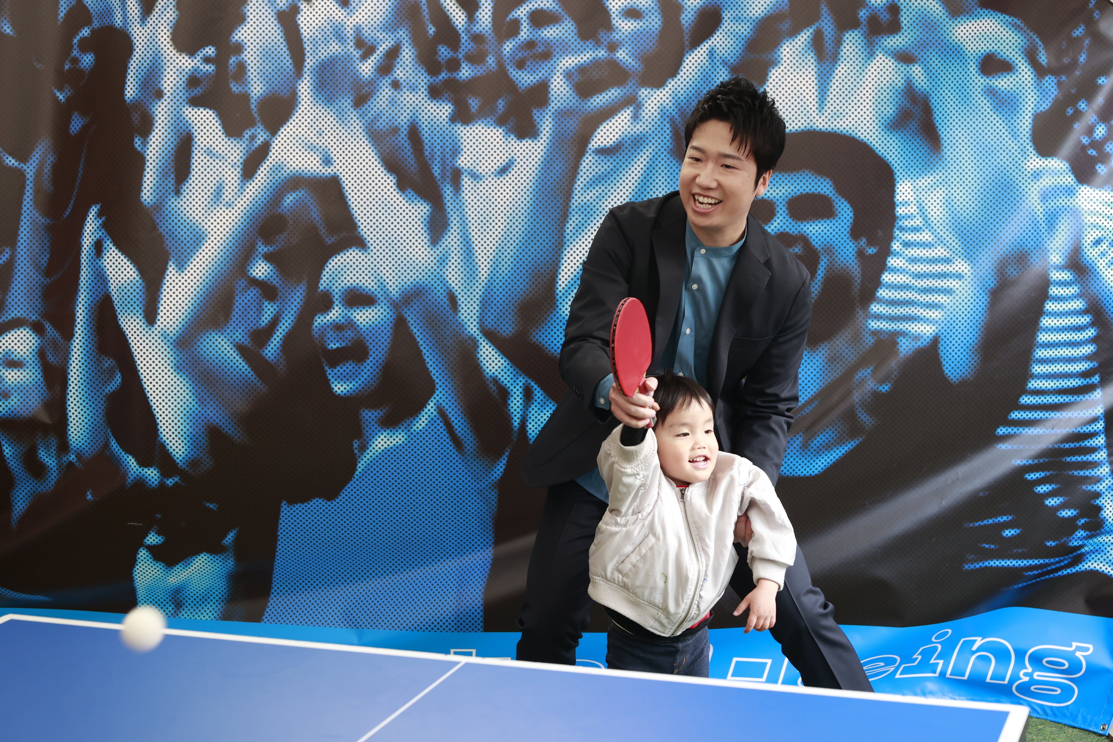 イベント終了後は、「世界卓球」のブースをサプライズで訪れ、来場者の子どもと一緒にサーブ体験に挑戦する姿も。