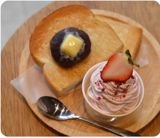 大須観音を店名の由来に持つ、名古屋発“さっと立ち寄れて、おいしいコーヒーが飲める”と人気のカフェから。愛らしいモーニングが登場。小倉あんとバターをトッピングしたトーストに、自家製いちごクリームを絞ったミルクジェラートを添えました。クリームやジェラートをトーストにのせるなど、お好みの食べ方で楽しんで。