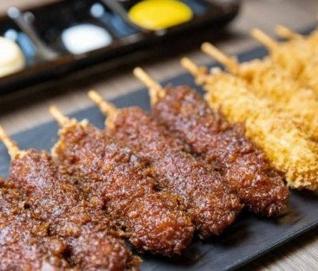 右)みそかつの元祖でもある串かつ。南九州産を中心とした質の良い豚肉のヒレ肉に、通常のとんかつとは別の衣を使用し、食感と味に変化を出しています。食べ歩きにもぴったりなので、観光のおともにどうぞ。