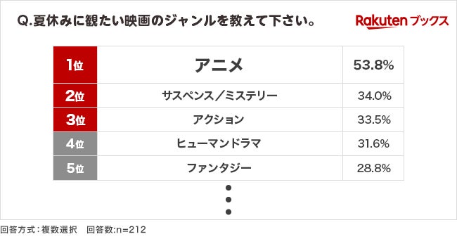 今年の夏休みを自宅で過ごすと答えたユーザーに対して、家で何をして過ごしたいか聞いたところ、1位は「動画配信サービスを見る」(69.0%)、2位は「スマホでSNSを見る」(57.5%)、3位は「ゲームで遊ぶ」(47.8%)という結果になり、自宅で楽しめる身近なエンタメやスマートフォンで手軽に楽しめるサービスに注目が集まりました。それ以外にも、「映画やドラマを見る」(46.9%)や「マンガを読む」(39.8%)などの回答も多く、夏休みのまとまった時間を使って自宅でエンタメ作品を楽しむ人が多くいることがわかりました。また、夏休みに映画を見たいと答えたユーザーに対して見たい映画のジャンルを聞いたところ、最多は「アニメ」(53.8%)、次いで「サスペンス/ミステリー」(34.0%)、「アクション」(33.5%)という結果になりました。