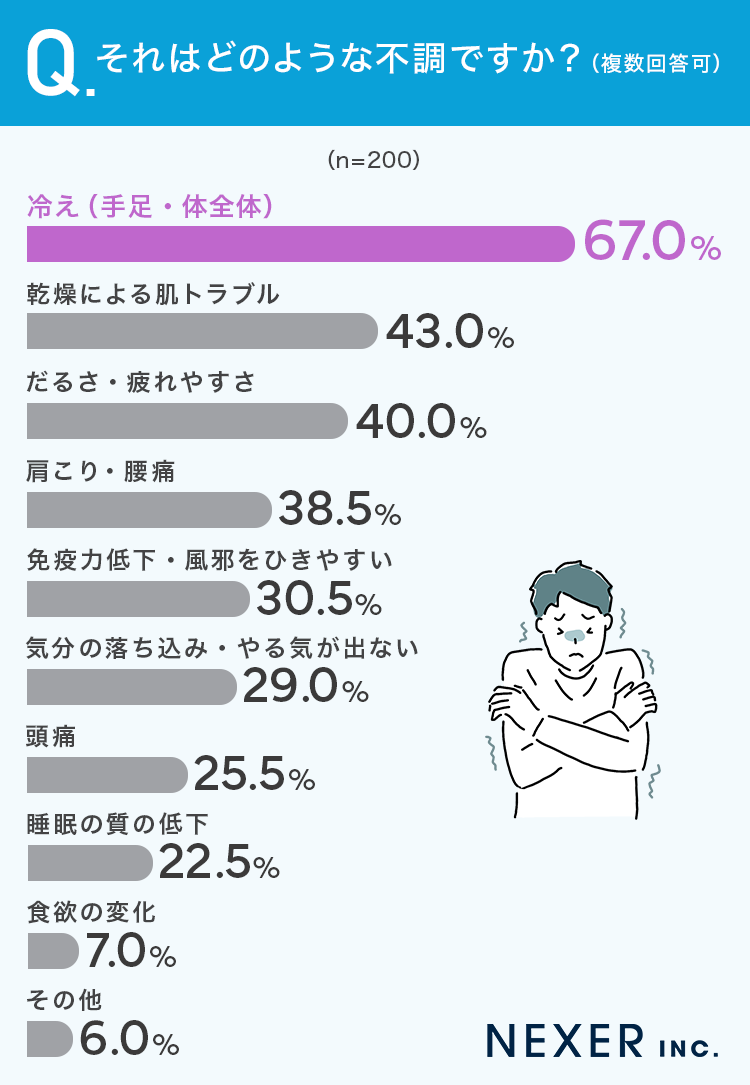 その結果、最も多かったのは「冷え(手足・体全体)」で67%でした。次いで「乾燥による肌トラブル」が43%、「だるさ・疲れやすさ」が40%、「肩こり・腰痛」が38.5%と続いています。