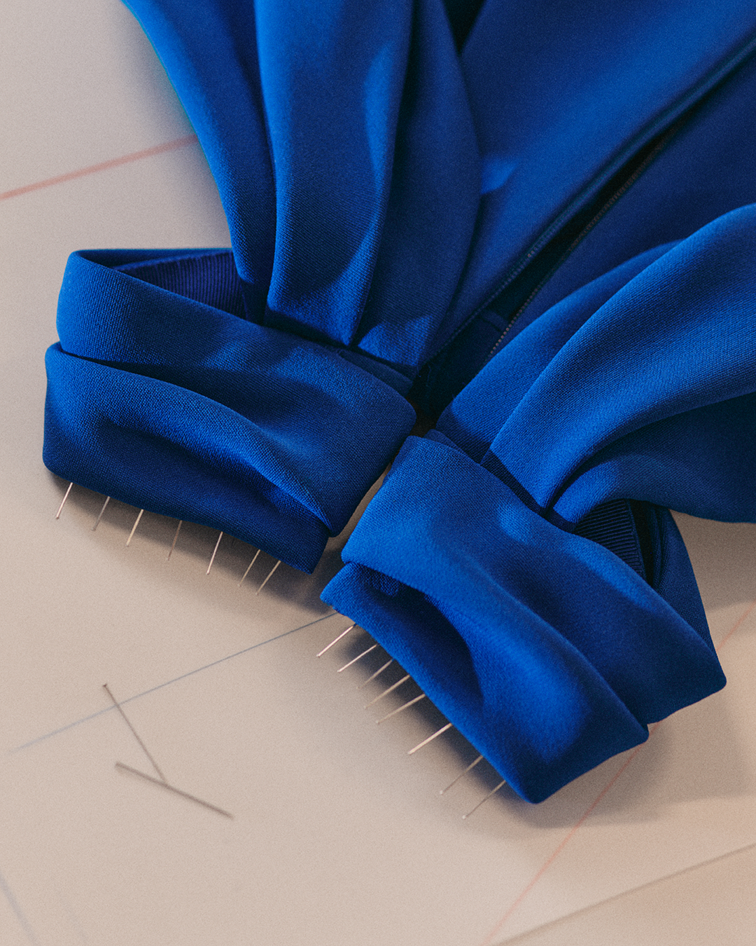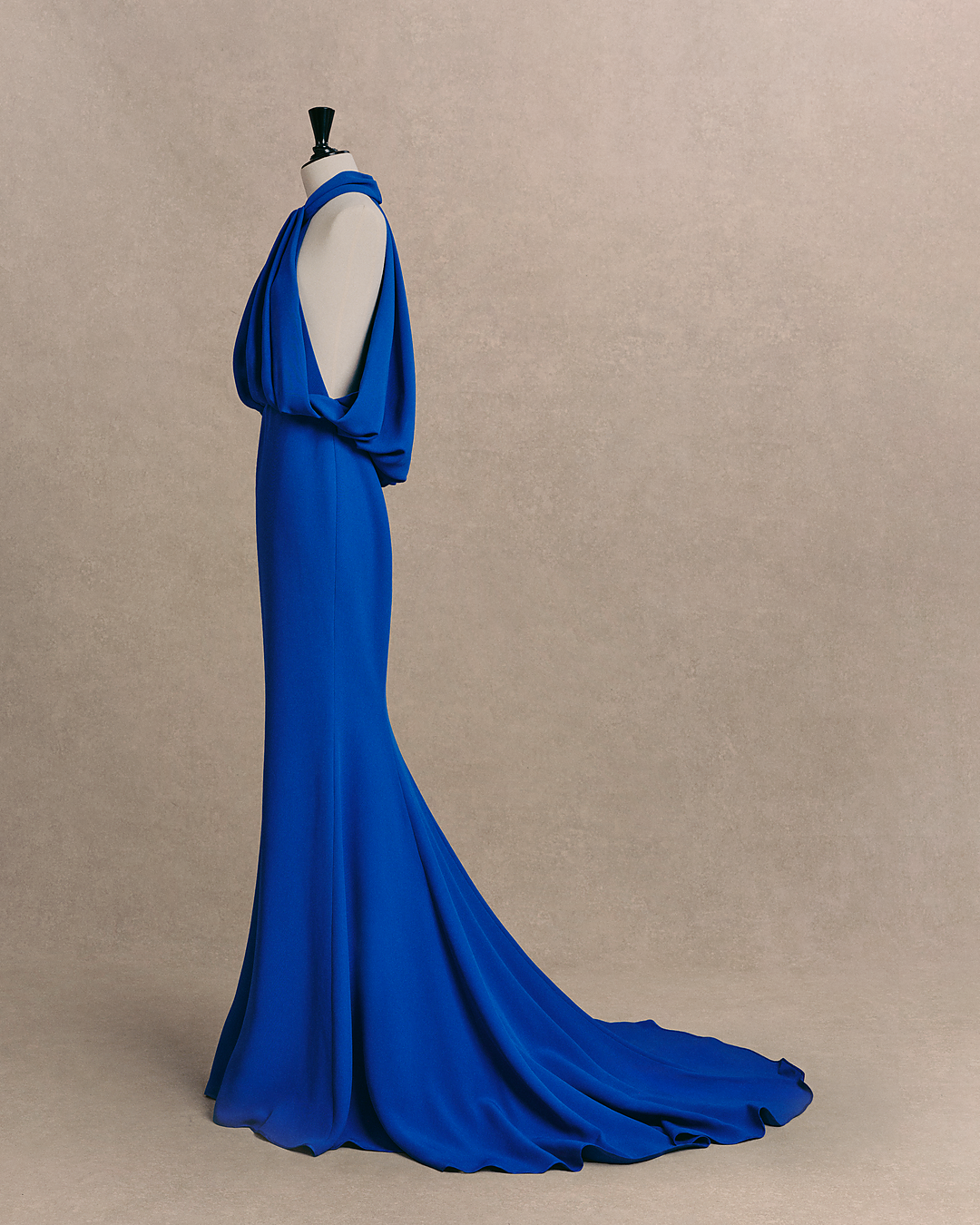 ブルーのクレープドレスは、ドレープを施したハイフロントカラーにトップを結び、構築的なフォルムと自然にゆったりとしたボリューム感を絶妙に組み合わせています。ヒップラインはフィット感があり、ハイフロントウエストは背面のブラウジングトップによってさりげなく隠されていて、長く流れるバックトレーンが、シルエットの縦のラインをより一層際立たせています。