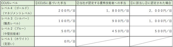 当社では、2025年4月から、協力会社の技能者を対象に、国土交通省のCCUSで認定されるレベルなどに応じて手当を支給する「技能者キャリアアップ制度」を導入します。技能者の能力・経験などに応じた処遇改善とともに、CCUSを活用した現場における技能者管理の効率化などを目的としています。