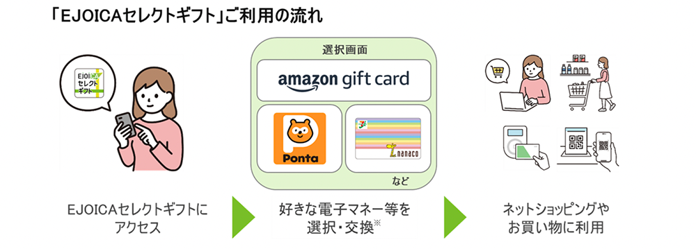 「EJOICAセレクトギフト」は、さまざまな電子マネー・ポイントなどの中から自由に選び、交換できるNTTカードソリューションが発行する電子マネーギフトです。ご利用者様は、EJOICAセレクトギフト交換用Webサイトへアクセスし、電子マネーなどから自由に選んで登録・交換いただけます。