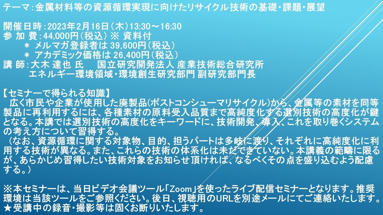 先端技術情報や市場情報を提供している(株)シーエムシー・リサーチ(千代田区神田錦町: https://cmcre.com/ )では、 各種材料・化学品などの市場動向・技術動向のセミナーや書籍発行を行っておりますが、 このたび「金属材料等の資源循環実現に向けたリサイクル技術の基礎・課題・展望」と題するセミナーを、 講師に大木 達也 氏 国立研究開発法人 産業技術総合研究所 エネルギー環境領域・環境創生研究部門 副研究部門長)をお迎えし、2023年2月16日(木)13:30より、 ZOOMを利用したライブ配信で開催いたします。 受講料は、 一般:44,000円(税込) 、 弊社メルマガ会員:39,600円(税込)、 アカデミック価格は26,400円(税込)となっております(資料付)。