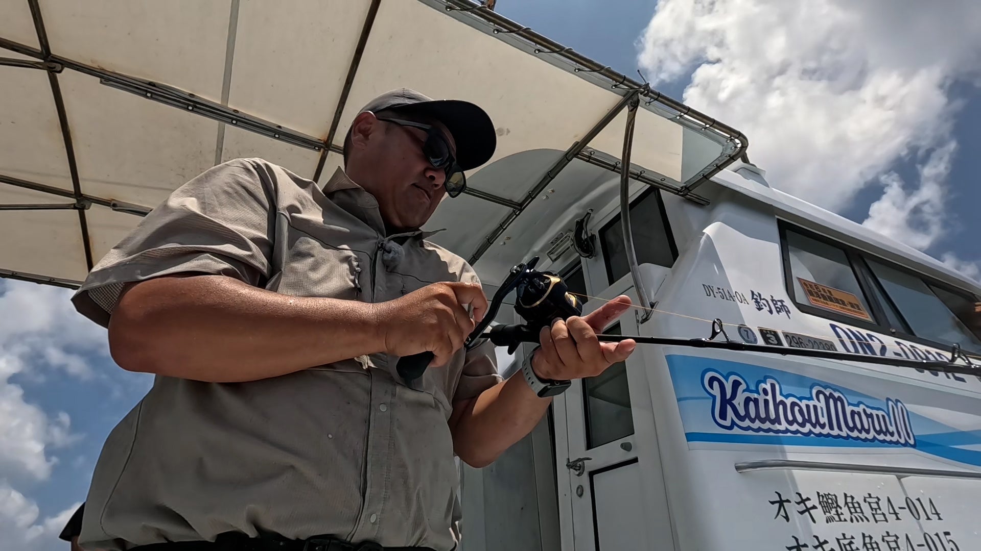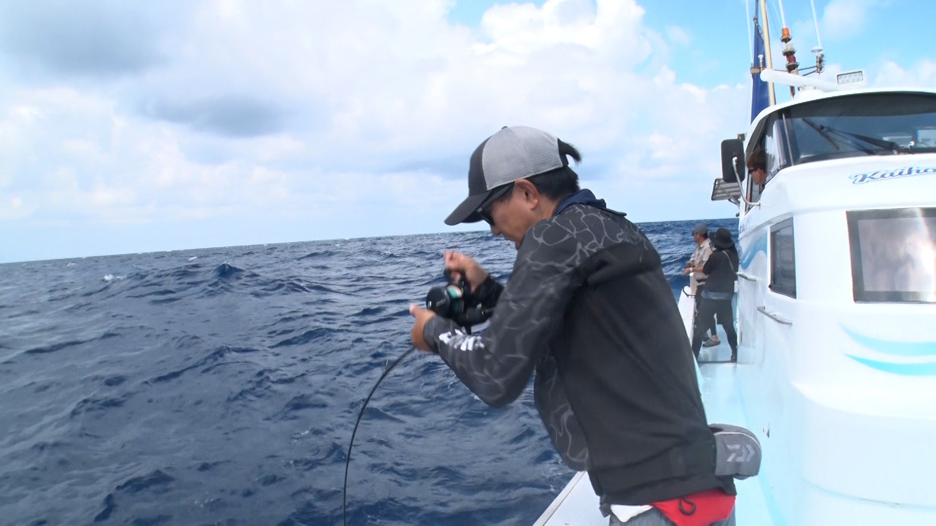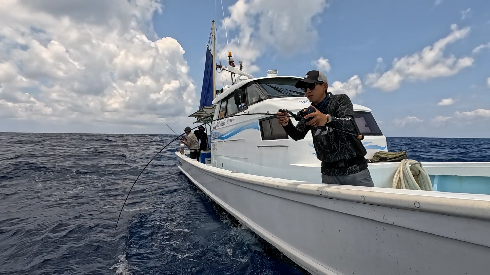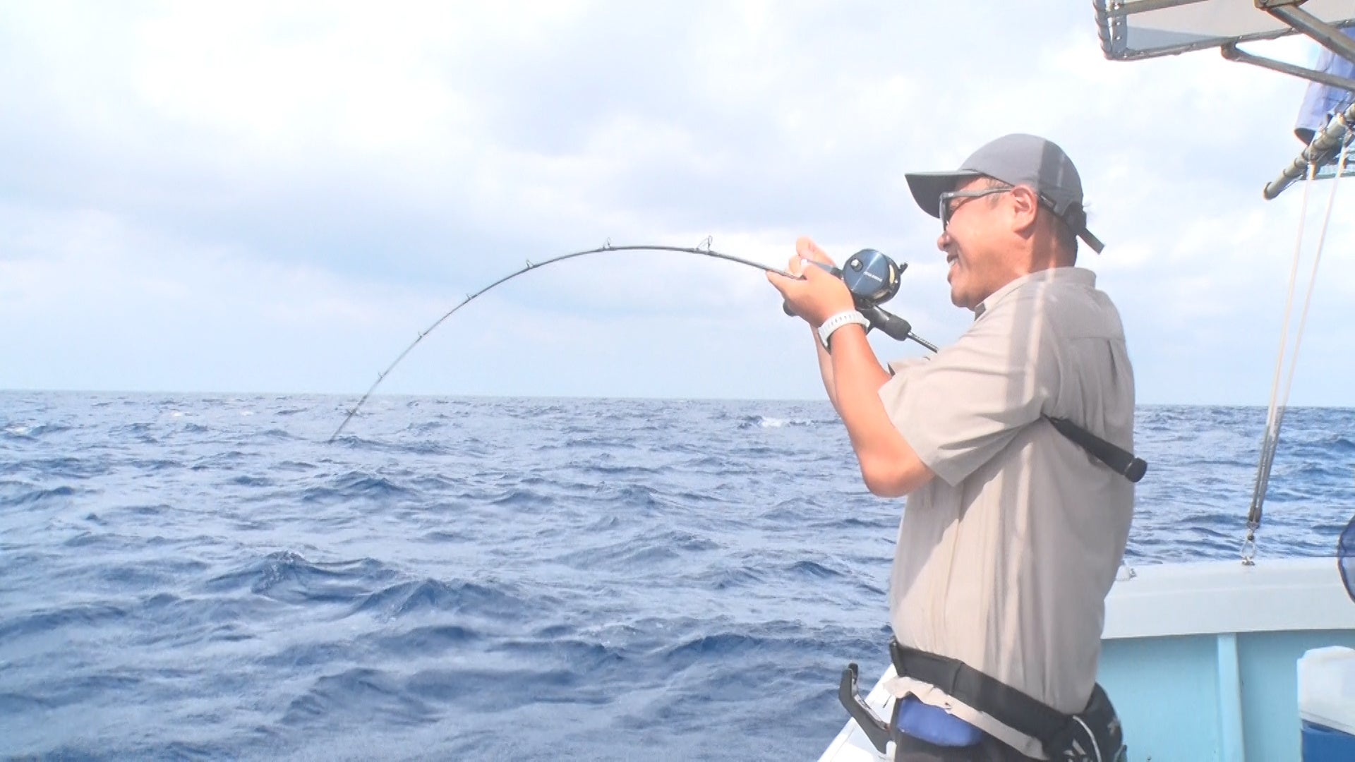 宮古島の海のポテンシャルに大喜びの2人。そしてより大型を狙うべくポイントを移動。期待が膨らむ中、強烈な引きが小中を襲う。果たしてキャッチなるか。