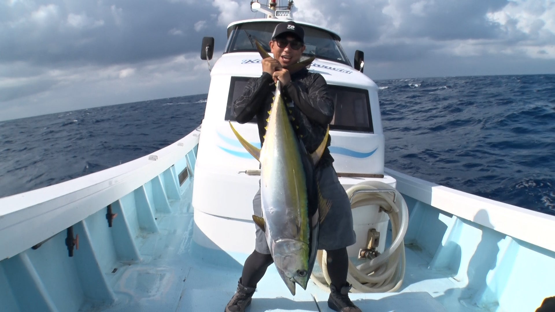狙うは40キロオーバーの大型。2人は350グラムのジグを選択。すると開始早々、清水がヒット!約20キロのキハダだ。