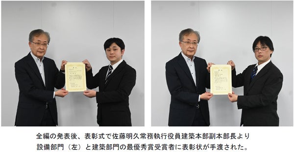 同発表会では、厳選した設備8編、建築10編の事例報告が行われました。生産施設、教育施設、集合住宅、商業施設など、多岐にわたる分野より新規性や独自性の高い技術的な取り組みが発表されました。また設備部門の発表後に、南口聡取締役常務執行役員建築本部長からあいさつがありました。各代表者の発表後、講評ならびに設備と建築、それぞれの分野ごとに最優秀賞1件、優秀賞1件、努力賞2件を選出し、表彰を行いました。