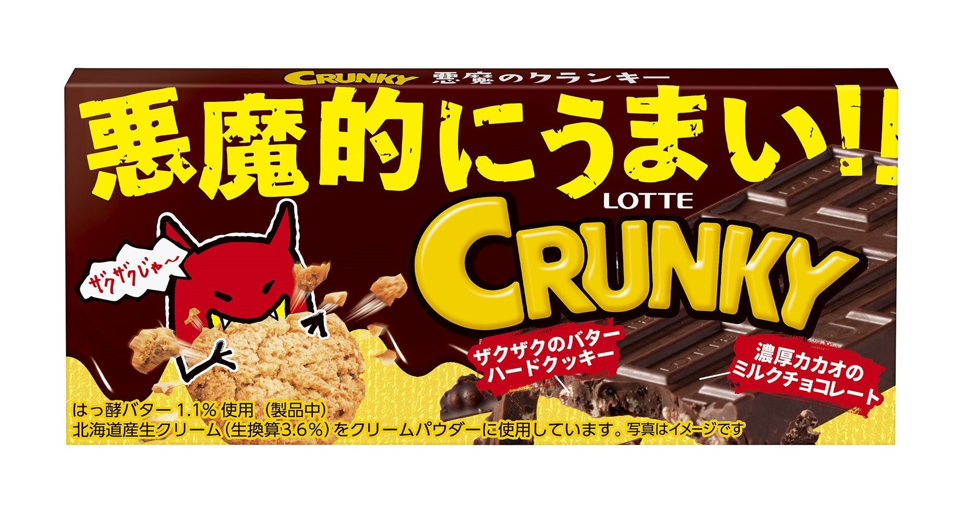 悪魔的にうまい!悪魔のクランキーが進化して再登場!通常品よりもカカオ分を高めつつ北海道産生クリームで仕立てた、濃厚なカカオの味わいを楽しめるミルクチョコレートです。さらに、パフとバターハードクッキーを過去最高に練りこむことでサクサク感とザクザク感がダブルで楽しめます。