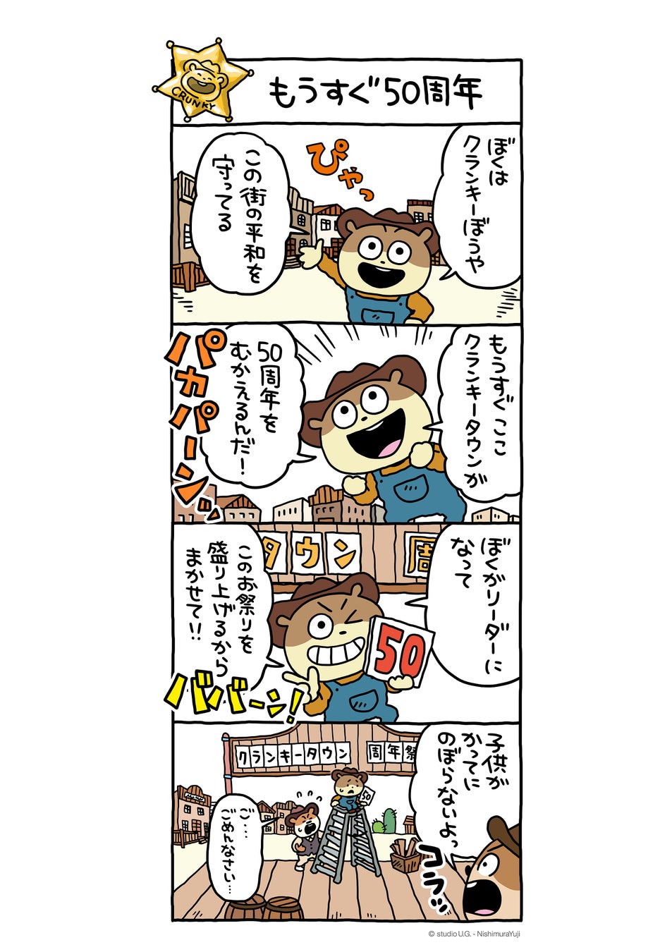 人間味にあふれ愛くるしいイラストで人気のクリエイター、にしむらゆうじ先生が手掛けるキャラクター「クランキーぼうや」です。2019年に期間限定フレーバーの裏面に4コマ漫画で登場し、クランキー公式キャラクターとしてデビューしました。じわじわと人気を獲得し、クランキーの公式サイトにも4コマ漫画を掲載。その後、LINEスタンプが登場するなど、着実に活動を積み重ねてきました。キャラクター誕生から5年を迎える今年、クランキーぼうやがクランキー発売50周年を盛り上げます!