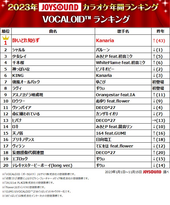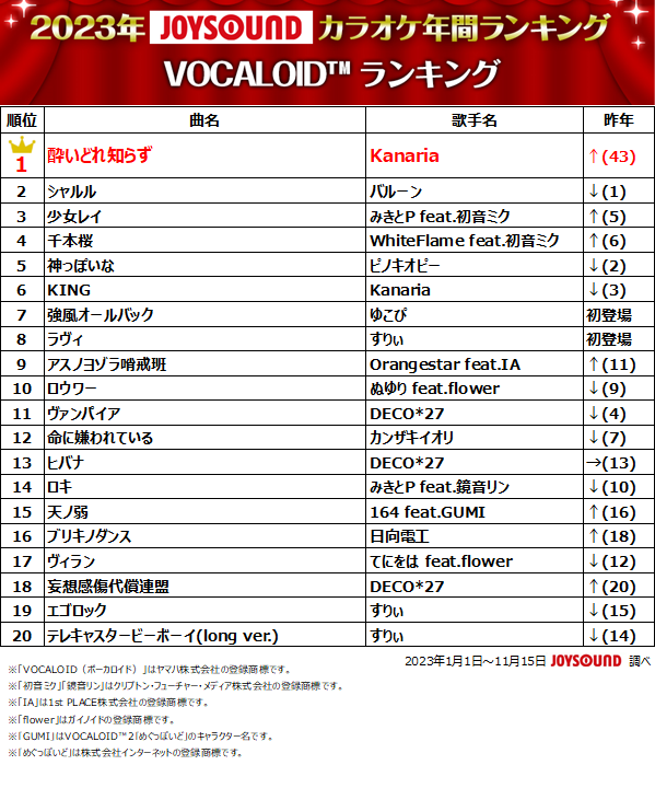 TikTokの「踊ってみた動画」で注目を集めたKanaria「酔いどれ知らず」が、昨年から大きく順位をあげて首位を獲得!ゲーム『プロジェクトセカイ カラフルステージ! feat.初音ミク』の人気曲がTOP20中17曲と上位を占める結果に。