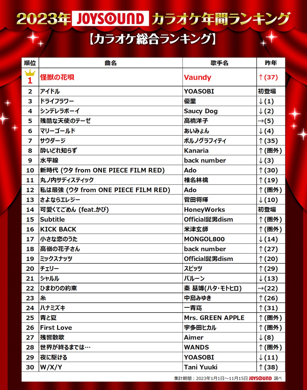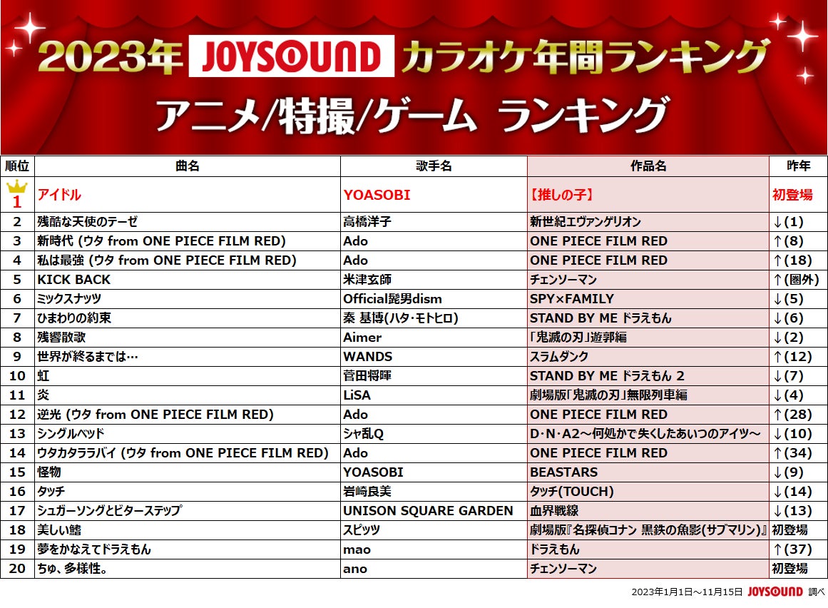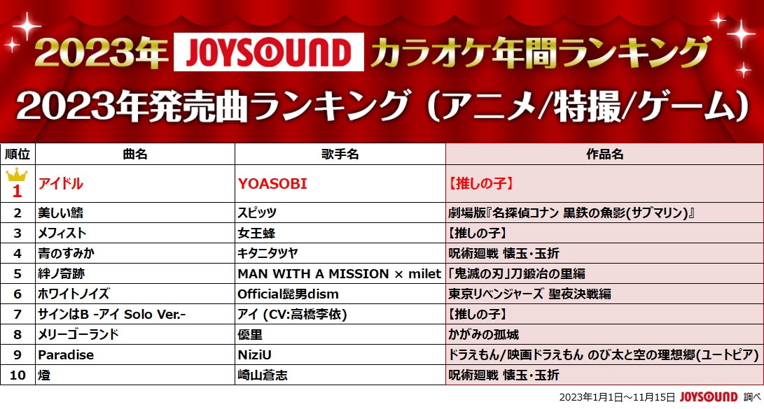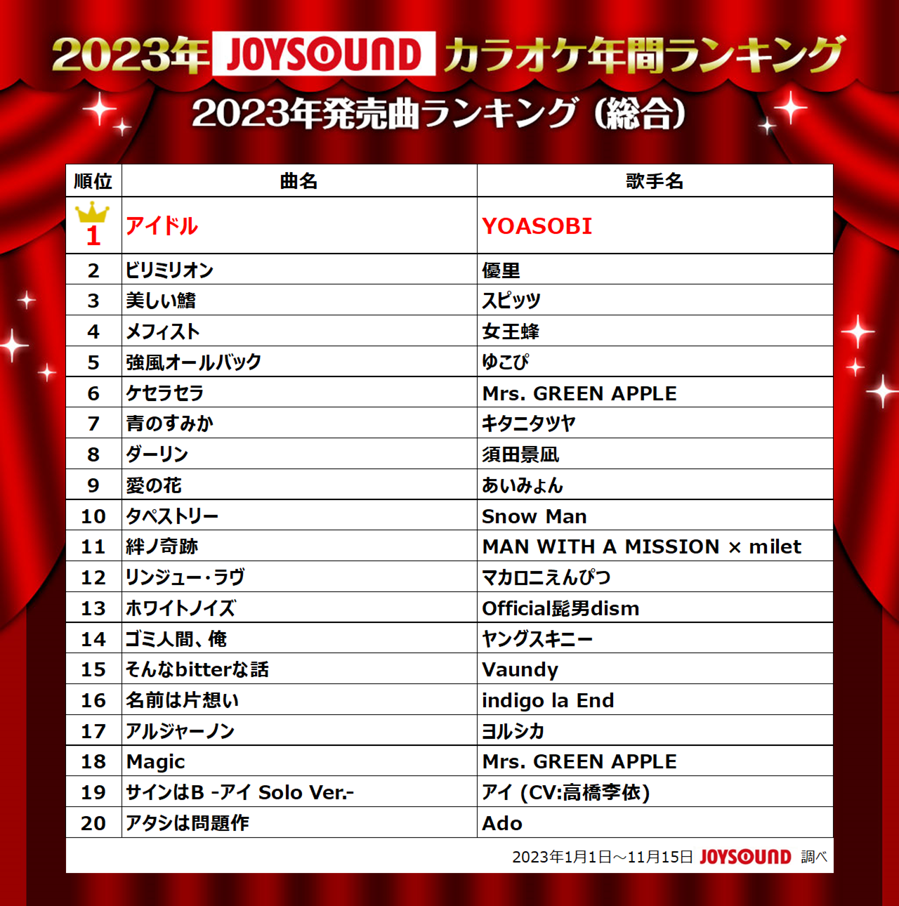 TVアニメ『【推しの子】』オープニング主題歌として大注目のYOASOBI「アイドル」も勢い見せる!JOYSOUNDが2023年カラオケ年間ランキングを発表!Vaundy「怪獣の花唄」が初の年間首位!