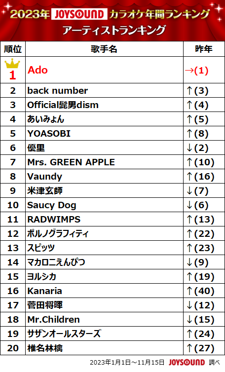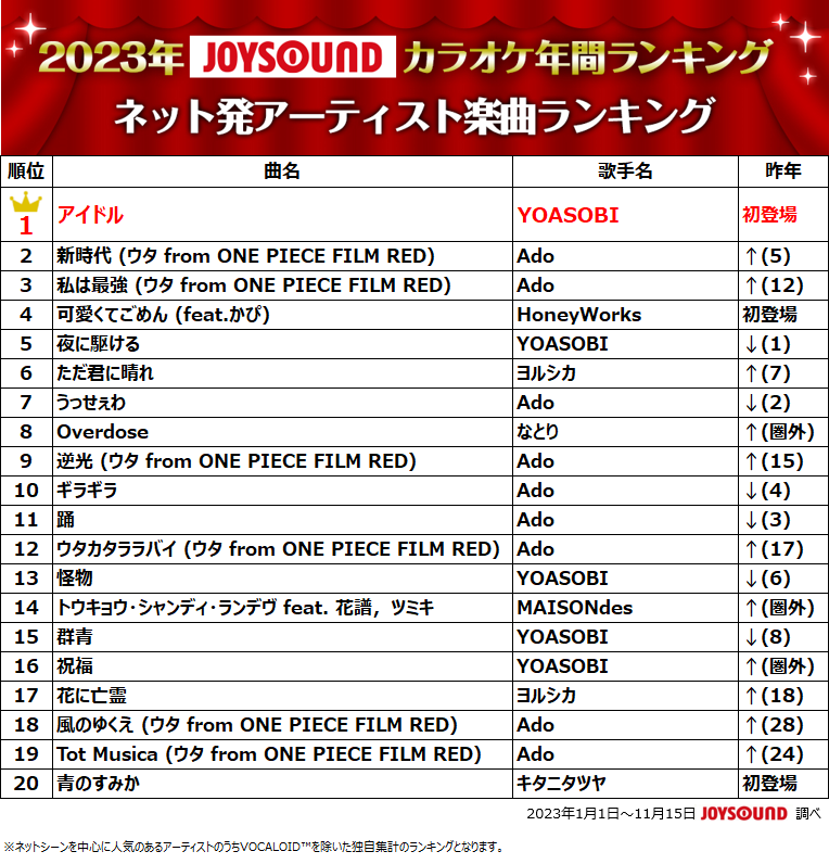 2023年JOYSOUNDカラオケ年間ランキングのアーティストランキングで、Adoが1位になったとのことで、本当に嬉しいです。