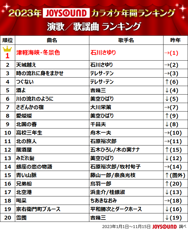 石川さゆり「津軽海峡・冬景色」「天城越え」が今年も上位を独占し、定番曲が人気を示す結果に。3位「時の流れに身をまかせ」に続き、テレサ・テン「つぐない」は昨年から順位を上げ4位を獲得。