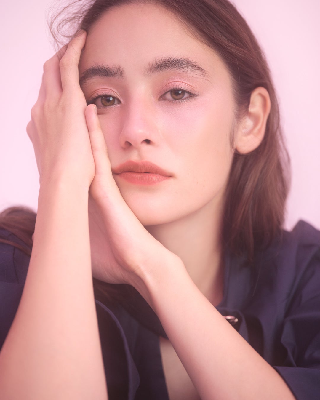 柔らかな光に包まれて凛とした表情の中に、素の自分を残したような仕上がり。アイブロウやブラックのマスカラでメリハリをつけ、瞳に意思を感じさせて。
