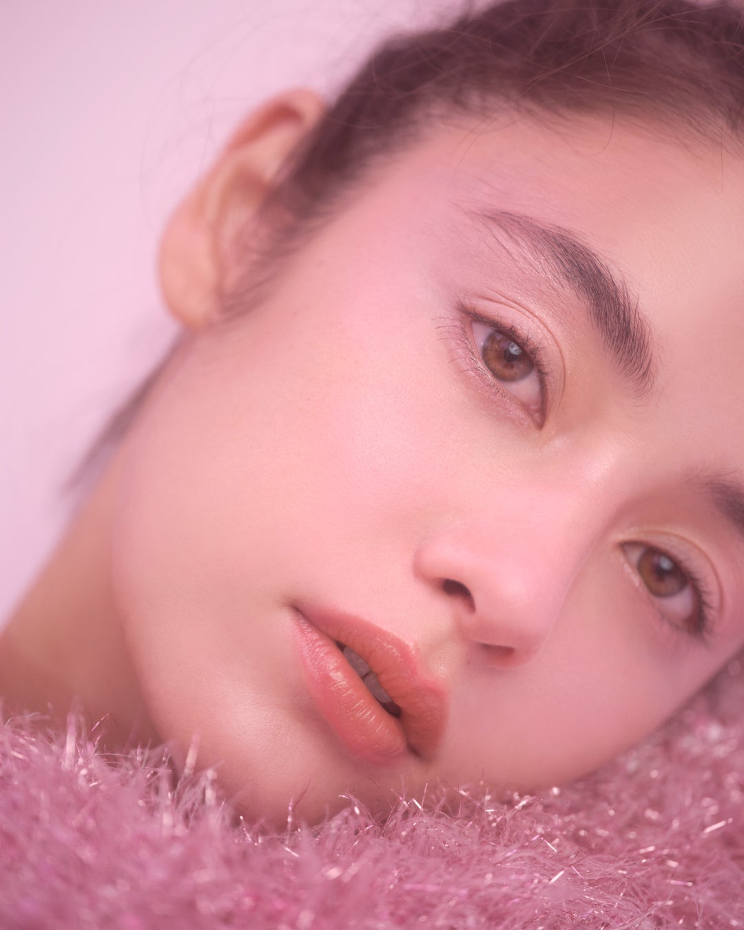 頬に乗せたシースルーピンクは柔らかな表情を引き立てます。