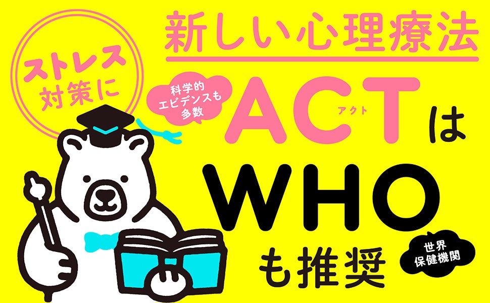 ACT(Acceptance and Commitment Therapy)は1980年代に米国で生まれ、1999年に最初の専門書が出版されました。「現状を受け止め、自分が大切にしていることを明確にして、それにもとづいて行動するための心理療法」で、心理療法の中では若手の方にもかかわらず、うつから不安神経症、慢性疼痛、麻薬中毒など、さまざまな症状に効果を発揮している実力派です。その効果に注目したWHO(世界保健機構)は、ACTの考え方を、ストレス対策として推奨しています。