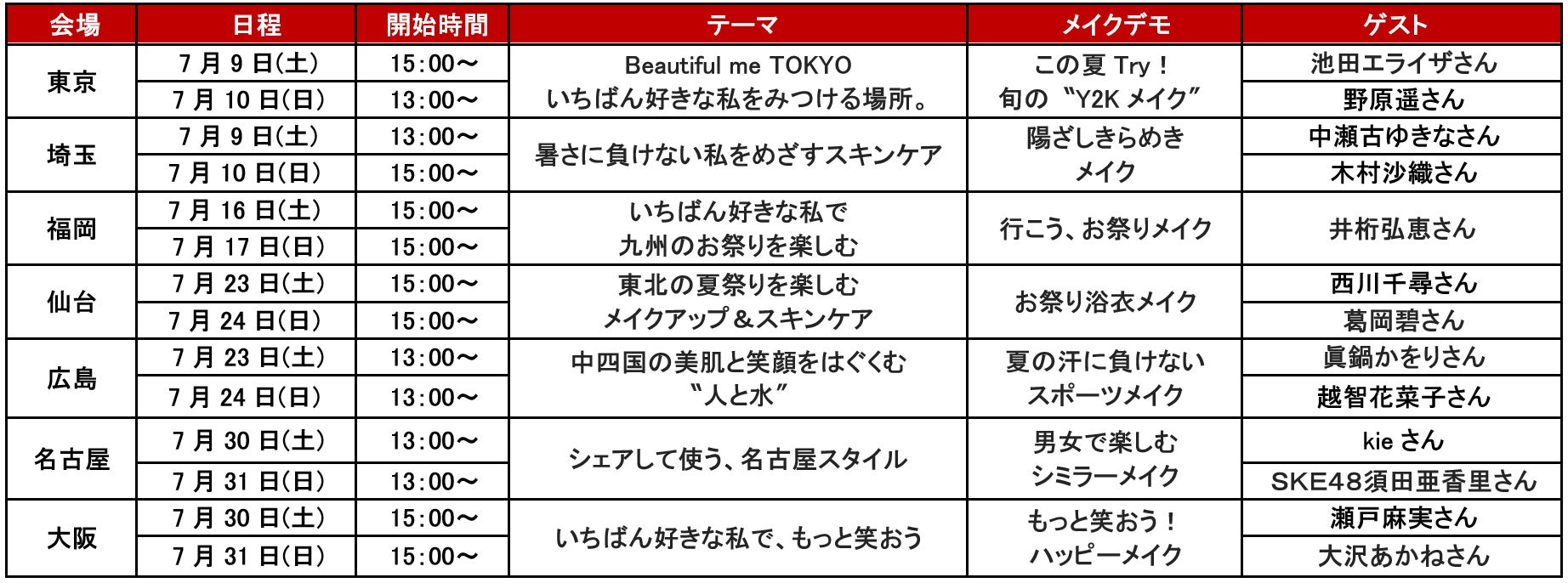 7月16日(土)・17日(日)の福岡会場にはアクアレーベル広告モデルの井桁弘恵さん、他会場でもさまざまなゲストが登場します。また、都市ごとのテーマに合わせたメイクデモンストレーションを行います。ステージの模様は、資生堂公式YouTubeチャンネル( https://www.youtube.com/user/SHISEIDOofficial )で同時に配信、同チャンネルと「Beautiful me STATION」デジタル会場でアーカイブ動画を視聴できます。