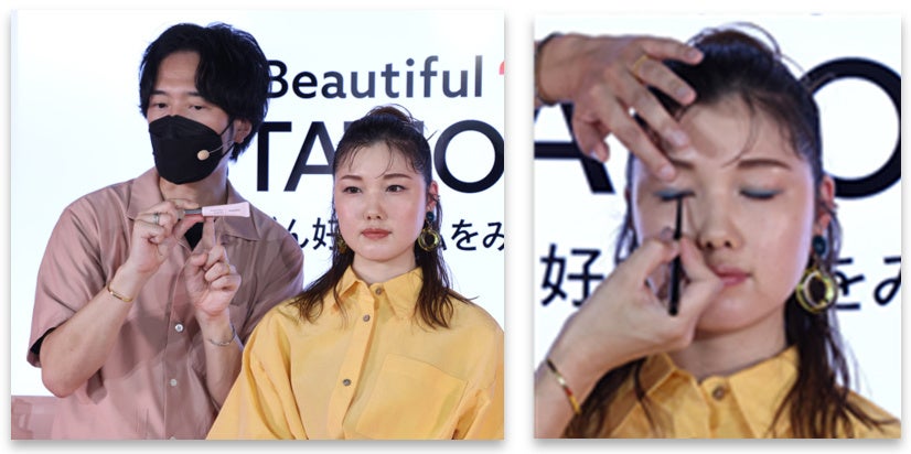 ステージではさらに、資生堂ヘアメイクアップアーティスト向井志臣が、この夏のトレンドとなっている「Y2Kメイク」のデモンストレーションを行いました。ファッションなどで流行している2000年頃のトレンド「Y2K」を取り入れ、今の旬の顔に見せるテクニックとして、(1)細眉、(2)ブルーのアイシャドー、(3)黒のアイライナーで目を囲む、④シアーなリップの4つのポイントを解説しました。
