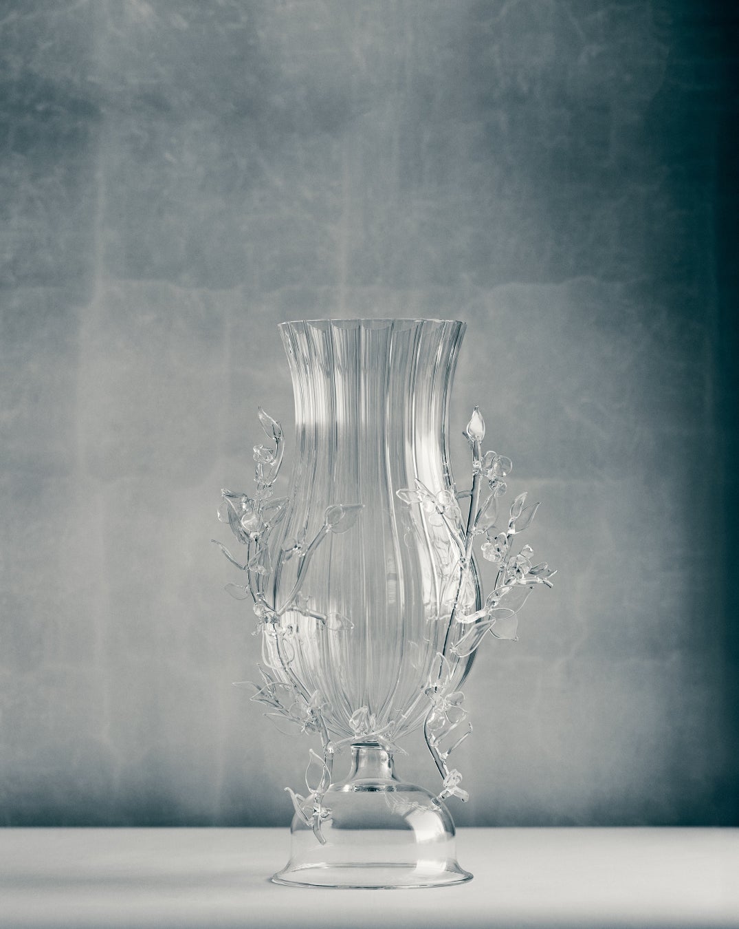 ディオール メゾンは、「オード ア ラ ナチュール」コレクションを発展させ、サム・バロンが魅惑的なプロポーションでデザインした、比類のない3点の花瓶を発表します。ミラノサローネ国際家具見本市の会期中、2025年4月8日から13日の期間でミラノのディオールブティックで先行展示されるこの傑出した作品の数々は、それぞれが約1メートルの高さで、そのサイズと華麗なディテールによって、卓越性の限界を超える彫刻作品に仕上がっています。ムッシュ ディオールにとって尽きることのないインスピレーションの源だった自然の美しさを讃え、これらのユニークな花瓶には、詩情あふれる植物モチーフで飾られた、抗いがたい魅力を放つ有機的なフォルムが落とし込まれています。透明な枝、花、そして繊細な葉が、いずれもこれらの羨望のオブジェに優美に絡みつき、まるで魔法にかけられた庭園を散策しているかのような気分を呼び起こします。そこに次々と広がるのは、季節と生命のさまざまなサイクルを描いた、夢のような光景。生まれたばかりの雄大な自然が、人の手によって美しく繰られていく様子です。これらのハンドクラフトされた作品には、イタリアの吹きガラス工法が採用され、熟練のガラス職人ならではの卓越したサヴォワールフェールと、そのチームワークが表現されています。台座のような上品なベースの上に配置されたボディは、丸みを帯びた曲線を湛え、アイコニックなフレグランス「ミス ディオール」の最初のボトル、つまり1947年に発表されたオリジナルのアンフォラボトルを彷彿とさせ、メゾンのヘリテージに限りなくクチュールなオマージュを捧げています。究極のアクセントとして施された手の込んだストライプ模様が、この羨望のアイテムにきらめきを与え、エレガントなタッチを贅沢に添えています。まさに、芸術作品の域にまで達した驚くべきこのクリエイションの数々は、創設者 ムッシュ ディオールのラッキーナンバーにさりげなく思いを馳せ、各8点の限定エディションで展開されます。