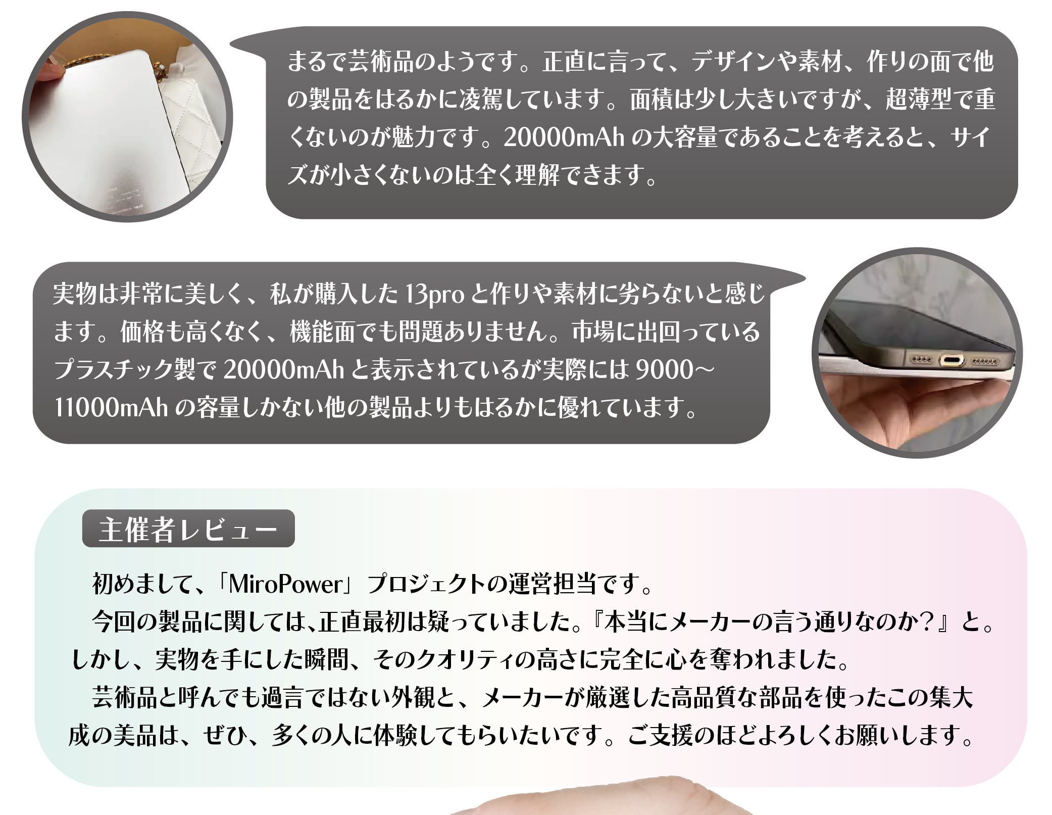 この度、「美」の流儀を貫くモバイルバッテリー「MiroPower」のクラウドファンディング【目標達成率2000%】を達成しました事をお知らせします。