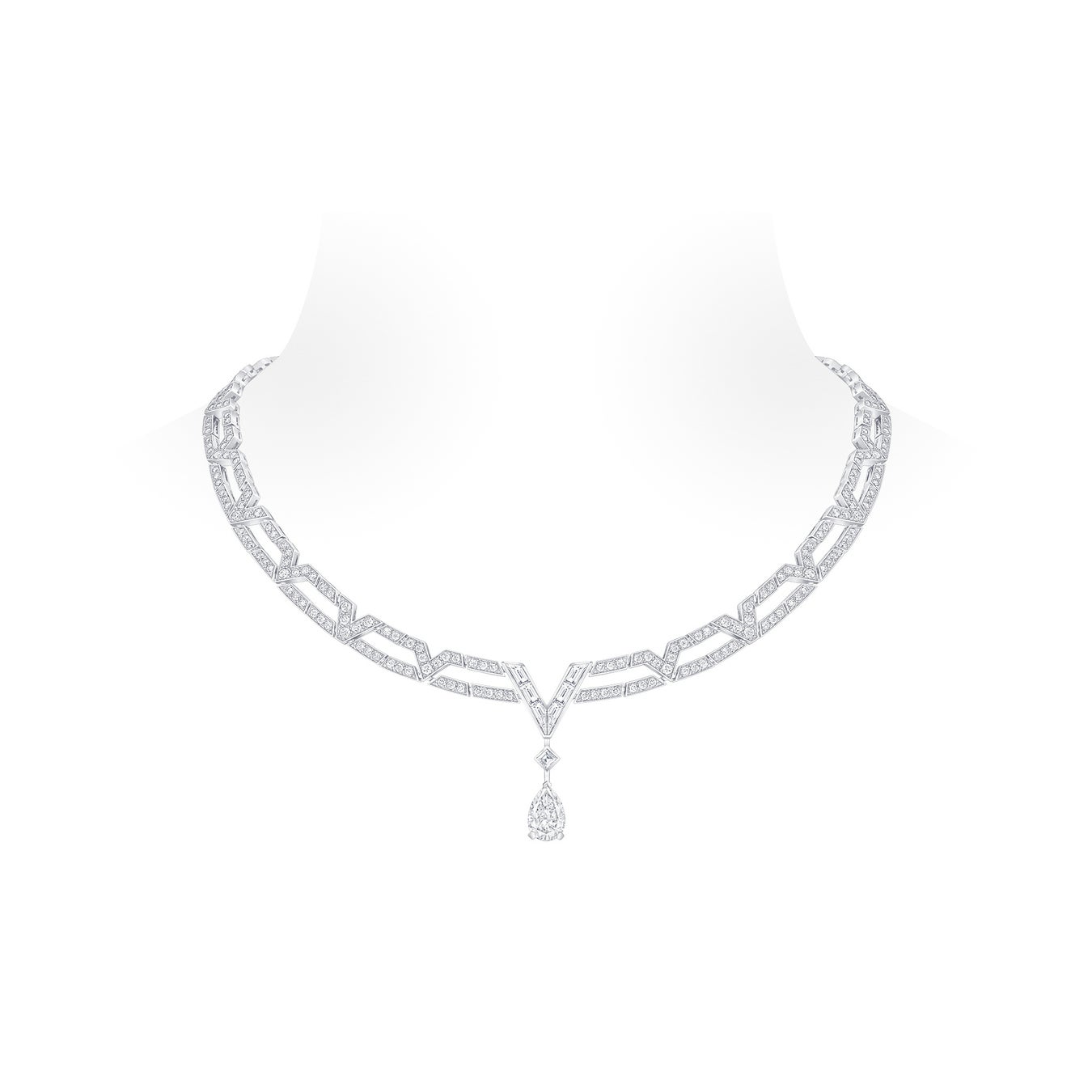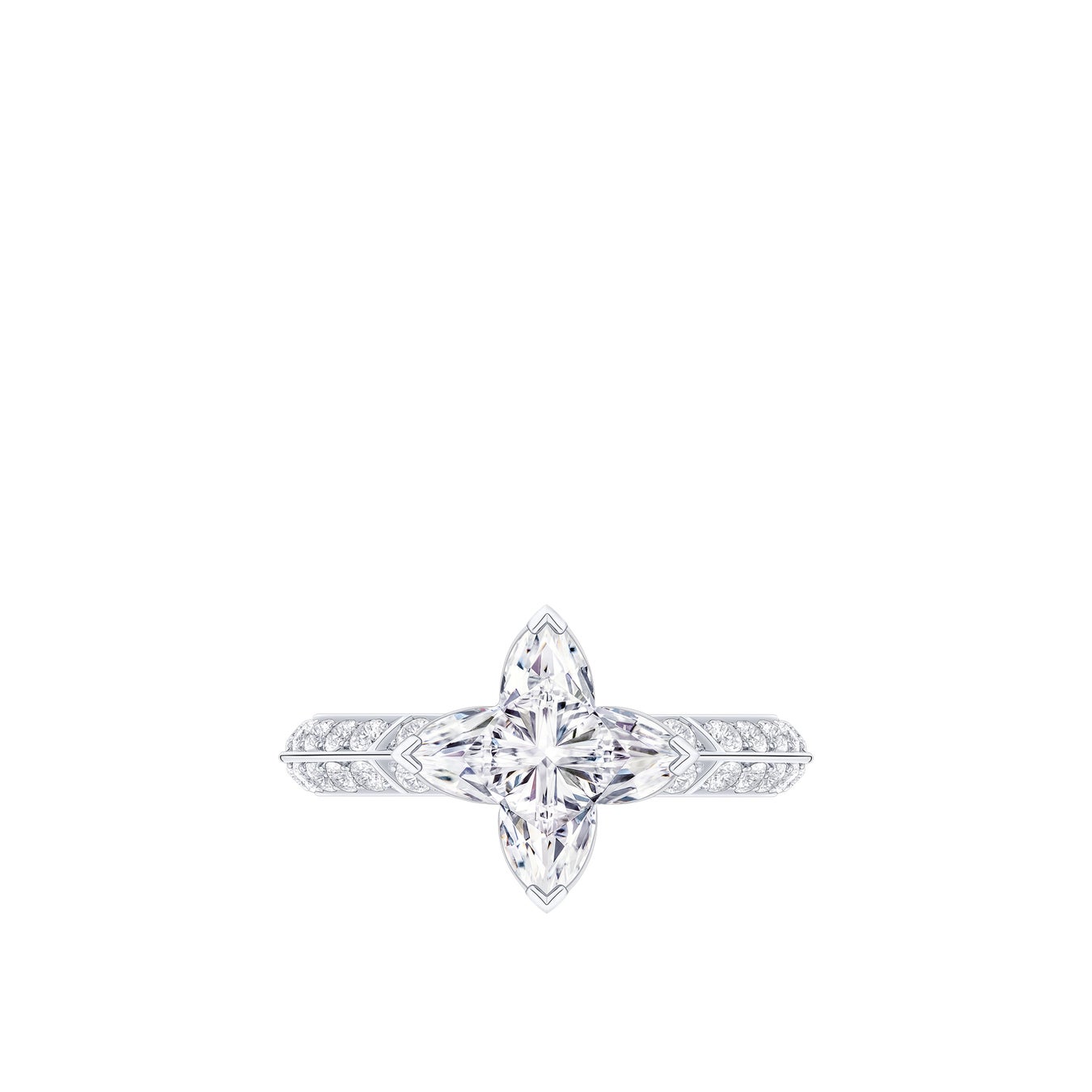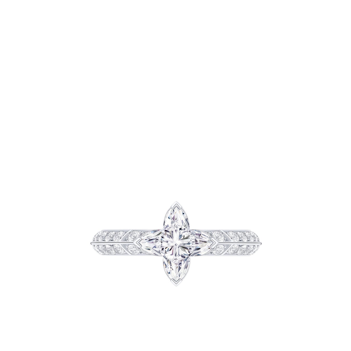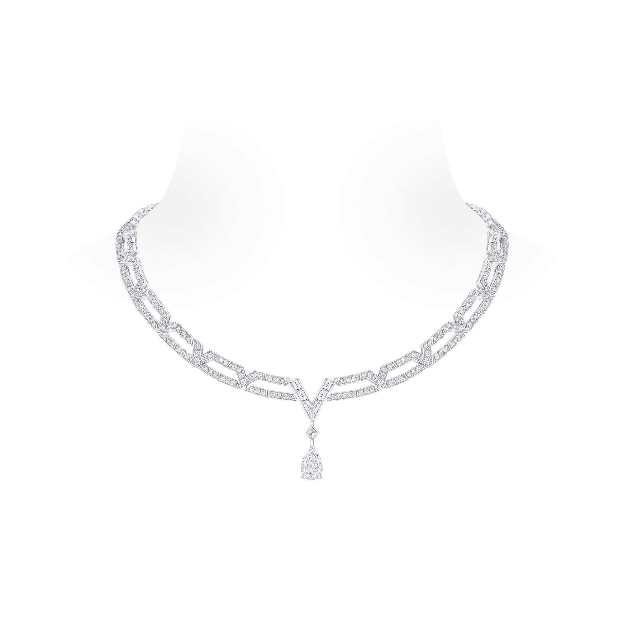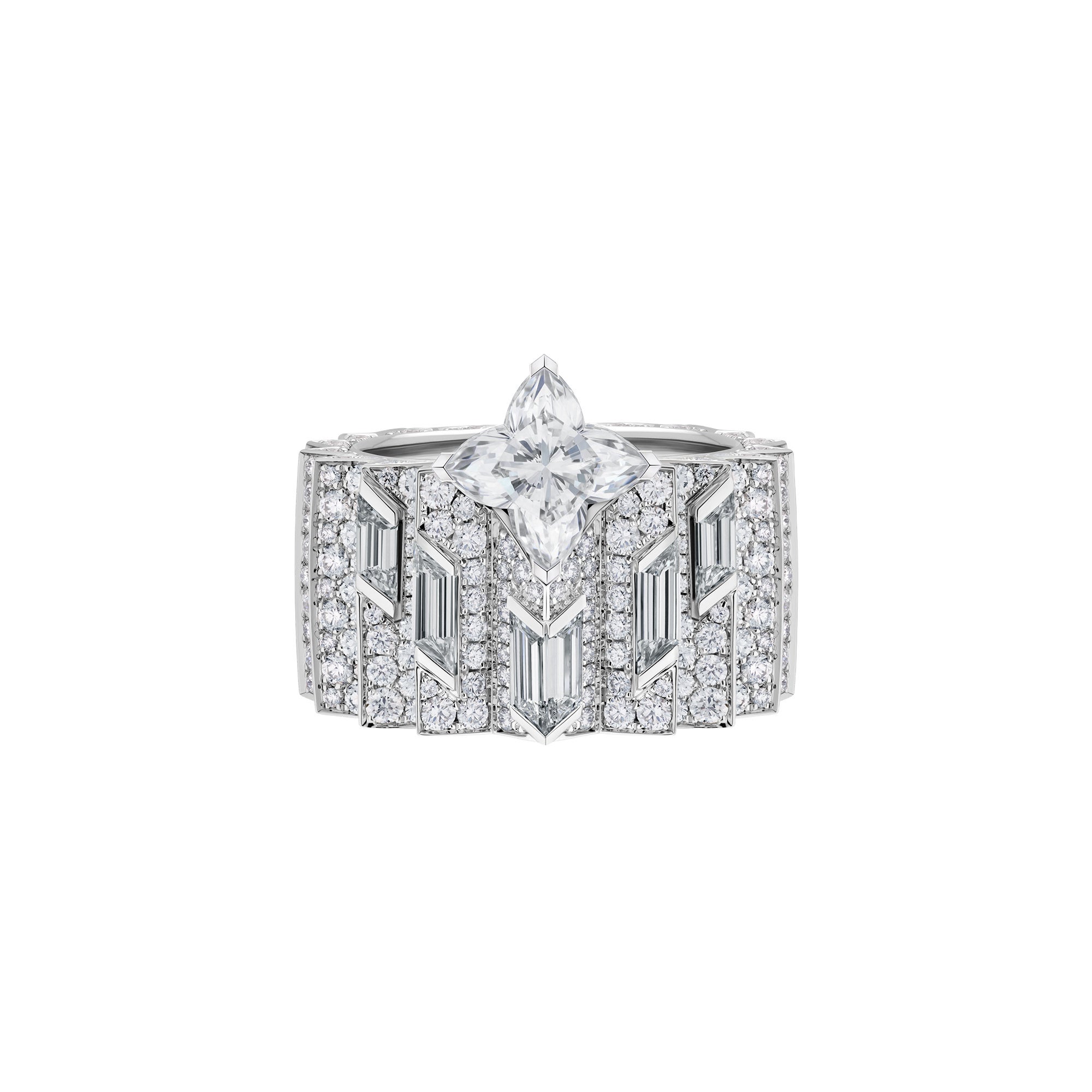 また、メゾンのハイジュエリー·コレクションより、ホワイトゴールドとダイヤモンドのネックレス「ピュア V」、さらにファインジュエリー·コレクション「LV ダイヤモンド」より、パヴェダイヤモンドをあしらったダブルリングとソリテールリング2点も着用しました。