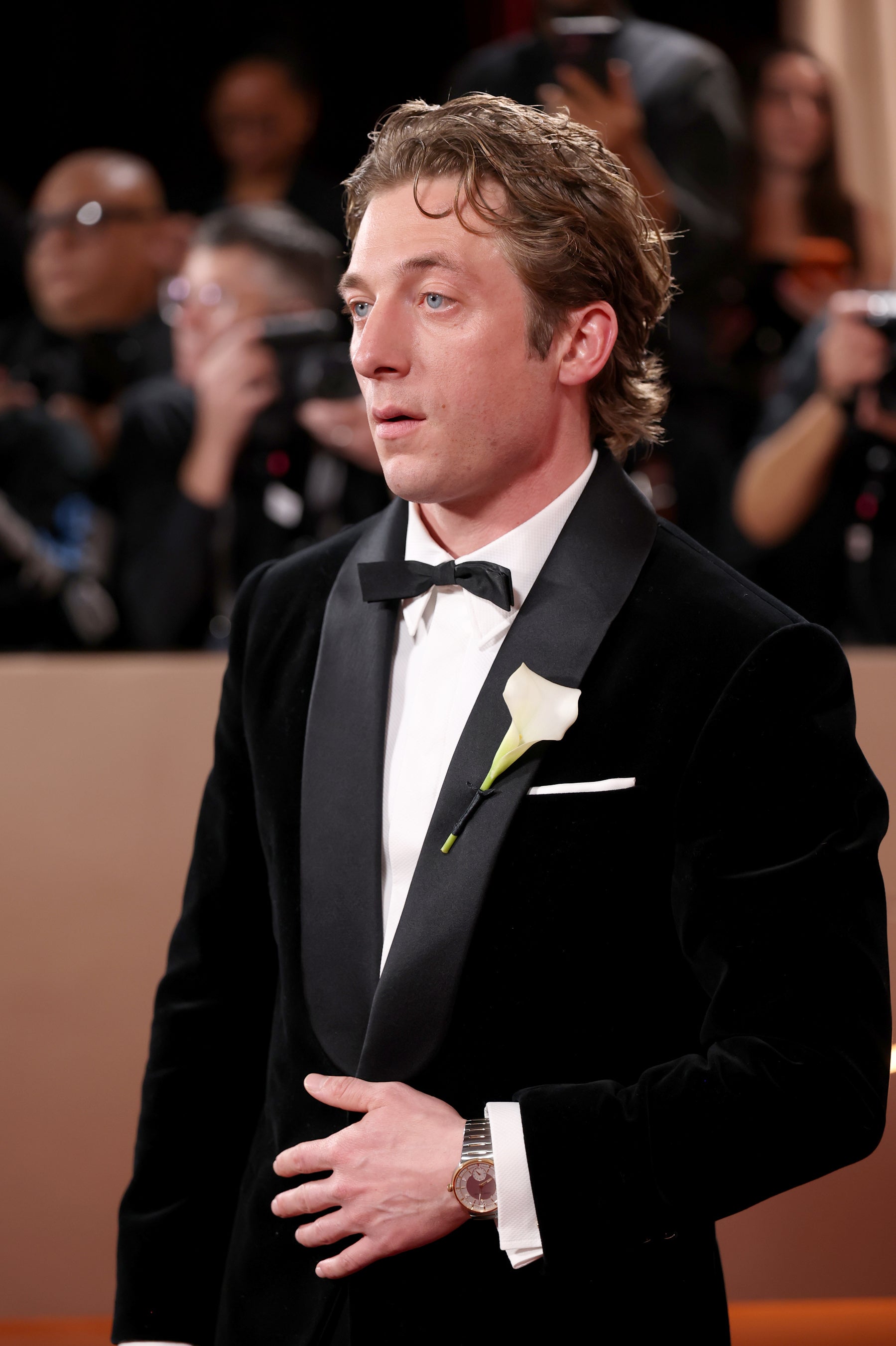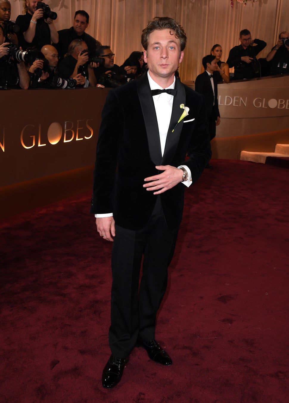ジェレミー·アレン·ホワイトは、ブラックのショールカラータキシードジャケットに、ブラックのパンツ、ホワイトのドレスシャツ、ブラックの蝶ネクタイ、ホワイトのポケットチーフ、ブラックのパテントレザー ダービーシューズをコーディネートしました。