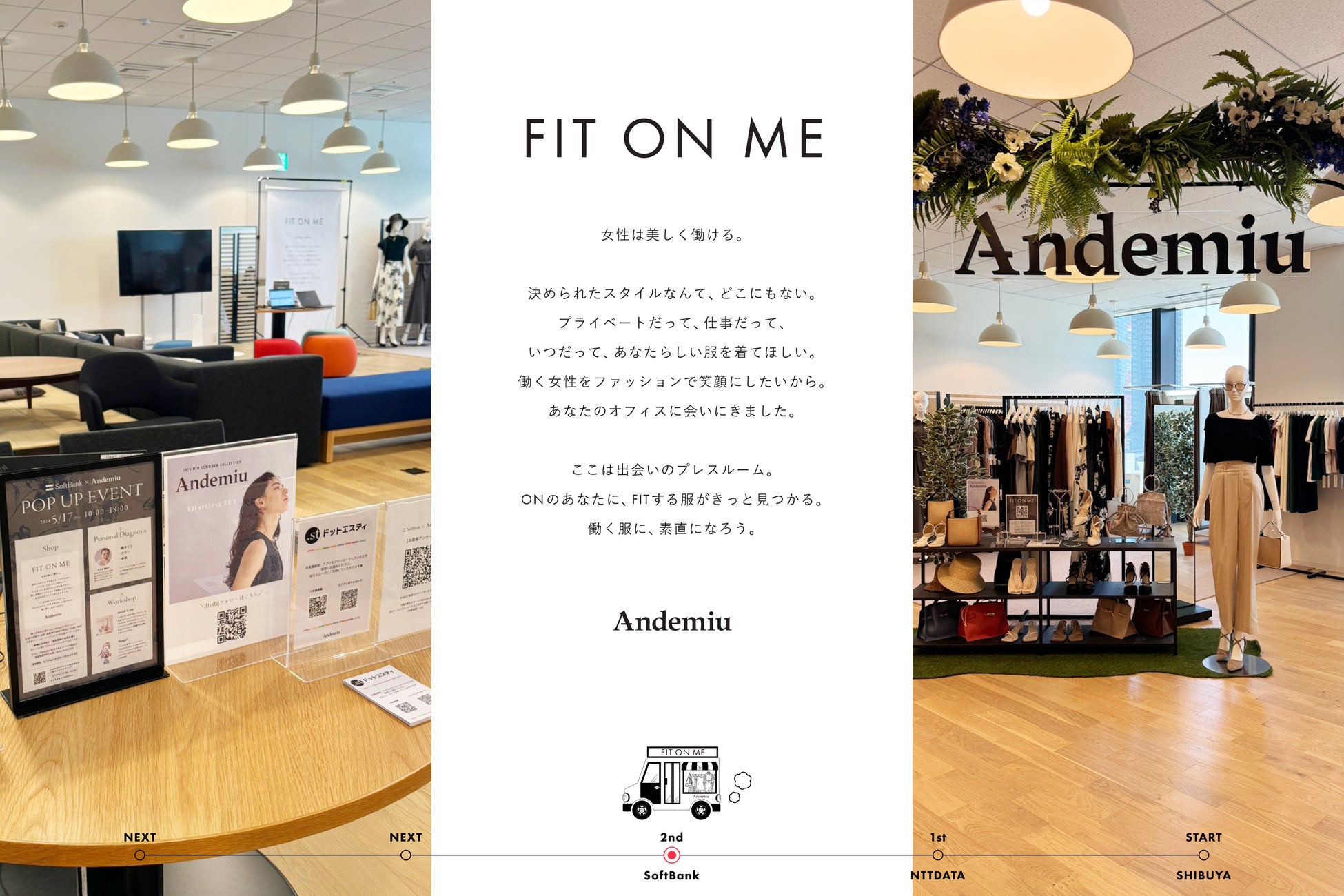 「Play fashion!」をミッションに掲げ、”グッドコミュニティ共創カンパニー”を目指す株式会社アダストリア(本部:東京都渋谷区渋谷2-21-1、代表取締役社長:木村 治)が展開するAndemiu(アンデミュウ)は、このたび、出張ショールーミングストア「FIT ON ME」の企業向け展開を本格スタートいたします。本取り組みは、女性の活躍をファッションの力で支援する企業向けのコンテンツとして、今後、全国各地へ展開を拡大してまいります。なお、2024年5月17日(金)には、ダイバーシティを重要な経営課題と位置付け、その一環として女性活躍推進に積極的に取り組んでいるソフトバンク株式会社の社員の皆さまに向けて、同社の本社ビル内に出張ショールーミングストアを出店いたしました。