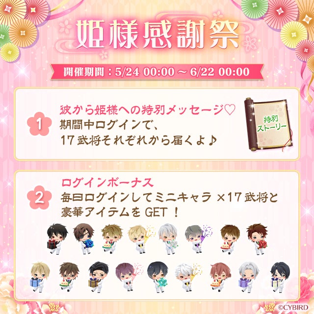 株式会社サイバード(本社:東京都渋谷区、代表取締役社長 兼 CEO 本島 匡、以下「サイバード」)が手掛ける、全世界でのシリーズ累計会員数3,500万人を誇る女性向け恋愛ゲーム「イケメンシリーズ」の人気タイトル『イケメン戦国◆時をかける恋』は、「姫様感謝祭」を開催中!七周年を記念した豪華な描き下ろしイラストを公開しました。