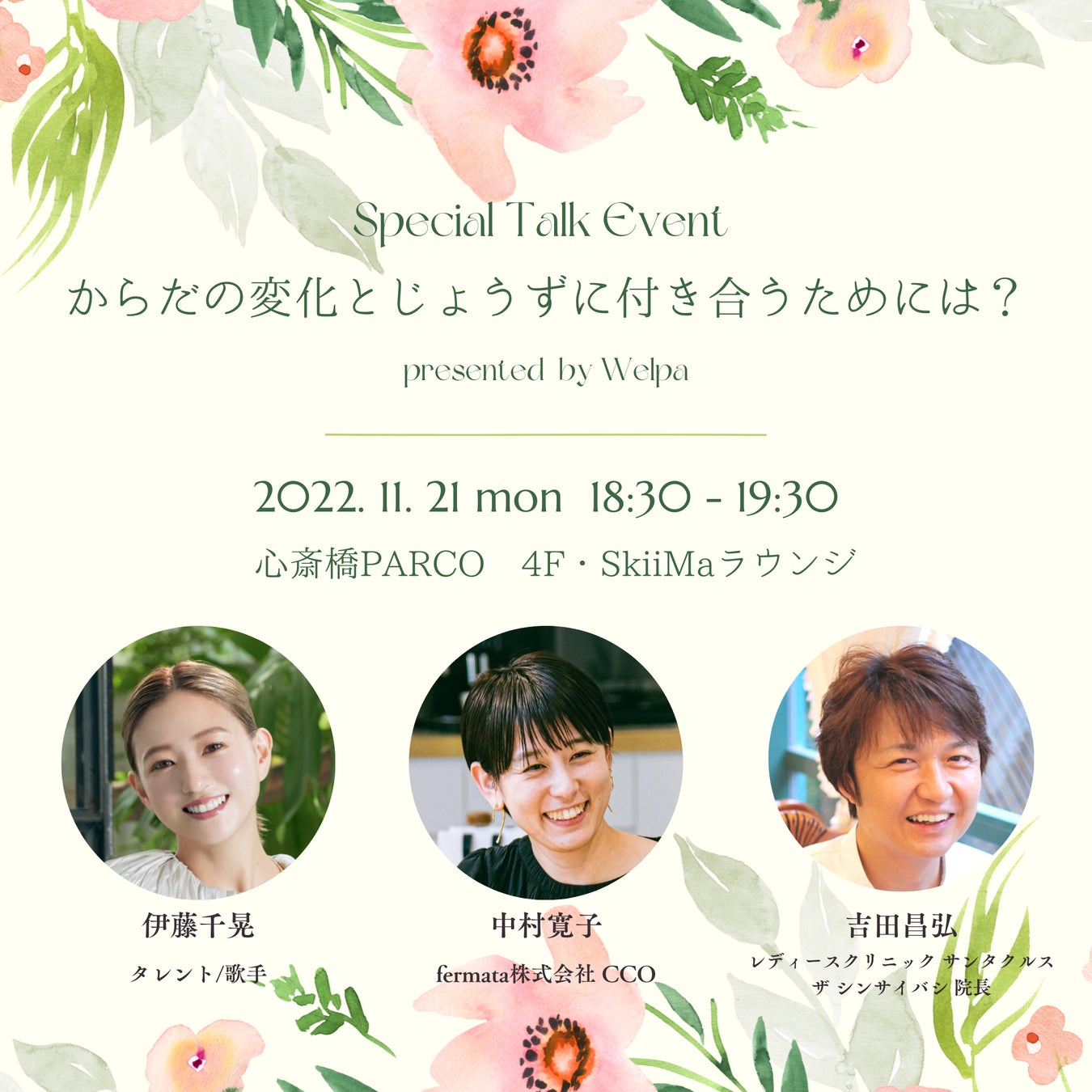 パフォーマンスグループAAAの元メンバーで、現在は一児の母であり、モデルやソロアーティストとして活躍する伊藤千晃さんをゲストにお迎えし、女性が経験するからだの変化と上手に付き合うためのコツや、普段は聞きたくても聞けない疑問について、不妊治療や分娩で日々多くの患者様と接している産科婦人科専門医の吉田 昌弘先生(レディースクリニック サンタクルス ザ シンサイバシ 院長)とフェムテック起業家の中村寛子さん(fermata株式会社CCO)にお話を伺います。