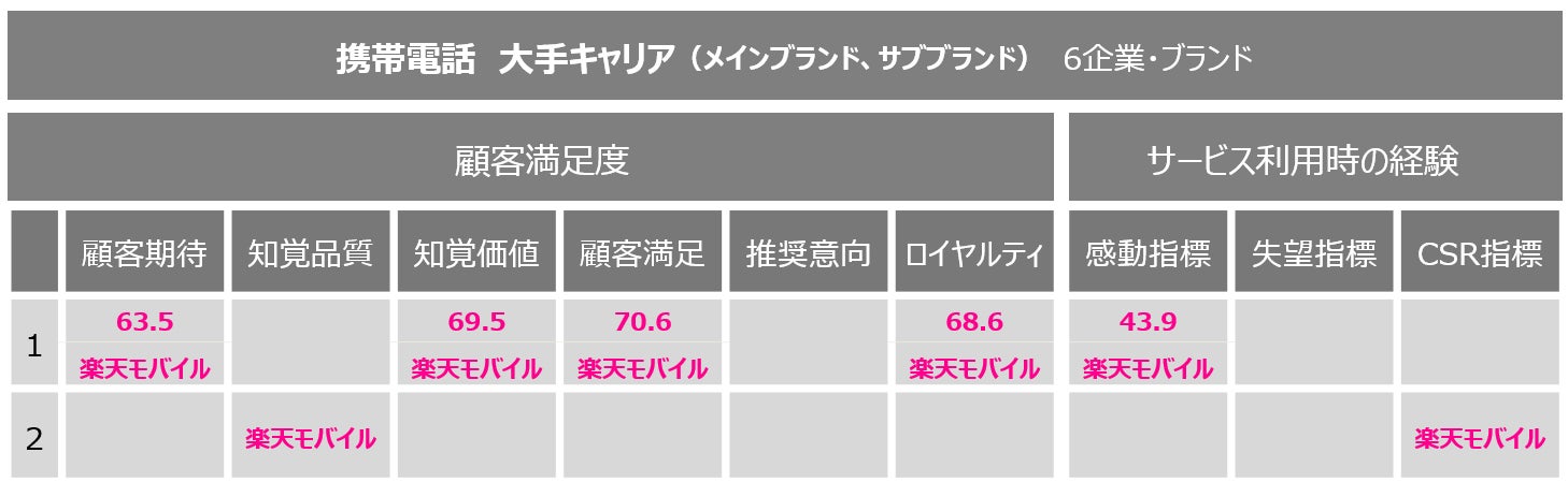 このたび、楽天モバイルは、顧客満足度に関する「顧客期待」「知覚価値」「顧客満足」「ロイヤルティ」の4指標と、サービス利用時の経験に関する「感動指標」の1指標において、第1位を獲得しました。