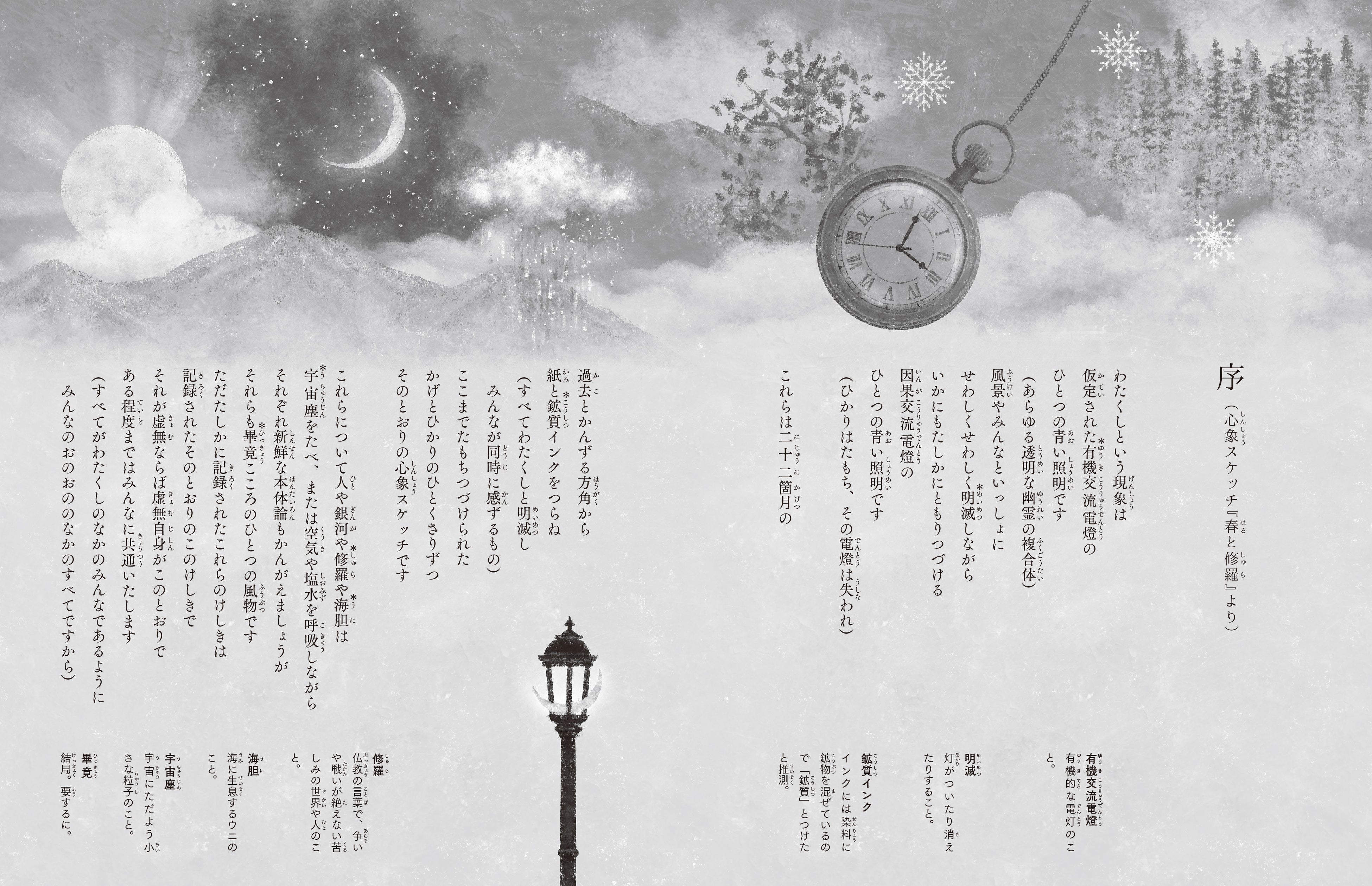 巻末には日本近代文学研究者・小埜裕二先生による各話の〔解説〕と、〔宮沢賢治と『春と修羅』〕(写真付き)を掲載しています。