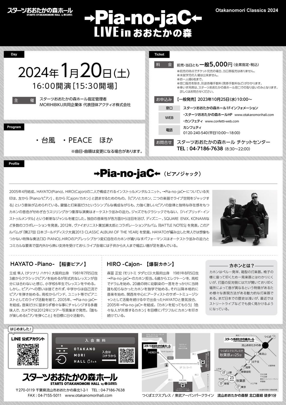 2005年4月結成。HAYATO(Piano)、HIRO(Cajon)の二人で構成されるインストゥルメンタルユニット。→Pia-no-jaC←についている矢印は、左から「Piano/ピアノ」、右から「Cajon/カホン」と読ませるためのもの。「ピアノとカホン、二つの楽器でライブ空間をジャックする」という意味が込められている。鍵盤と打楽器だけというシンプルな構成ながらも、力強く激しいピアノの旋律と独特な存在感をもつカホンの音色がせめぎ合うスリリングかつ重厚な演奏はオーケストラ並みの迫力。ジャズでもクラシックでもない、「ハイブリッド・インストゥルメンタル」という斬新なジャンルを確立した。独自の音楽性が各方面から注目を浴び、ディズニー、SQUARE ENIX、KONAMIなど多数のコラボレーションを発表。2012年、ヴァイオリニスト葉加瀬太郎とコラボレーションアルバム「BATTLE NOTES」を発表。このアルバムが「第27回 日本ゴールドディスク大賞2013 CLASSIC ALBUM OF THE YEAR」を受賞。HAYATOが編み出した常人では想像もつかない特殊な奏法「3D PIANO」、HIROのアグレッシブかつ変幻自在のカホンが織りなすパフォーマンスはオーケストラ並みの迫力とコミカルな要素で国内外から熱い支持を受けており、ライブ会場には子供から大人まで幅広い層が足を運んでいる。