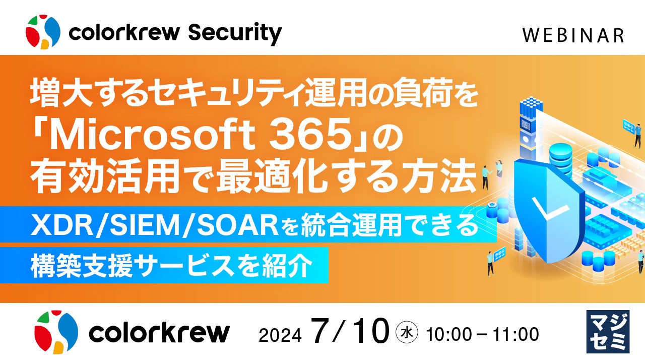 さらに、2023年に日本マイクロソフトの「Secure multicloud environment Award」を受賞したColorkrewが提供する「Microsoft 365セキュリティ支援」サービスを紹介。独自の脅威検知機能や柔軟なアラートのカスタマイズなどに加え、Microsoft 365ライセンスで使用可能なセキュリティ・サービスの導入支援、その後の監視運用まで総合的に支援するソリューションについて、その概要や導入効果などをご説明します。「セキュリティベンダーや製品を統合したい」「セキュリティ運用のコストを抑えたい」という方は、ぜひご参加ください。