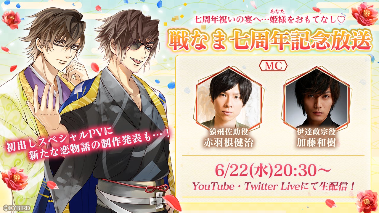 番組MCには「猿飛佐助」役の赤羽根 健治さん、「伊達政宗」役の加藤 和樹さんをお呼びし、『イケメン戦国◆時をかける恋』七周年祝いの宴で姫様をおもてなしします。