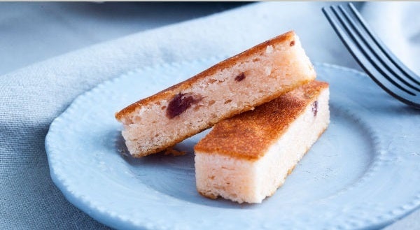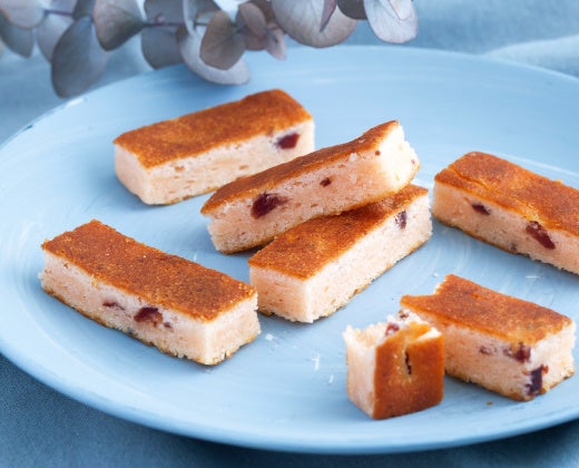 福岡県産あまおう苺パウダーを使用した生地に甘酸っぱいクランベリーを入れ、しっとりと焼き上げたスティック型のベイクドチーズケーキ。