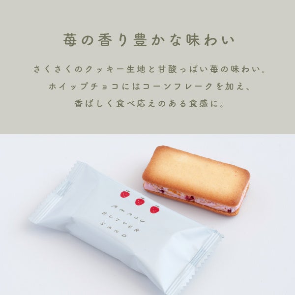 あまおう苺パウダーとラズベリーのフリーズドライが入ったホイップチョコを、芳醇なバターの香るクッキーでサンドしました。ホイップチョコにはコーンフレークを加え、香ばしく食べごたえのある食感に。