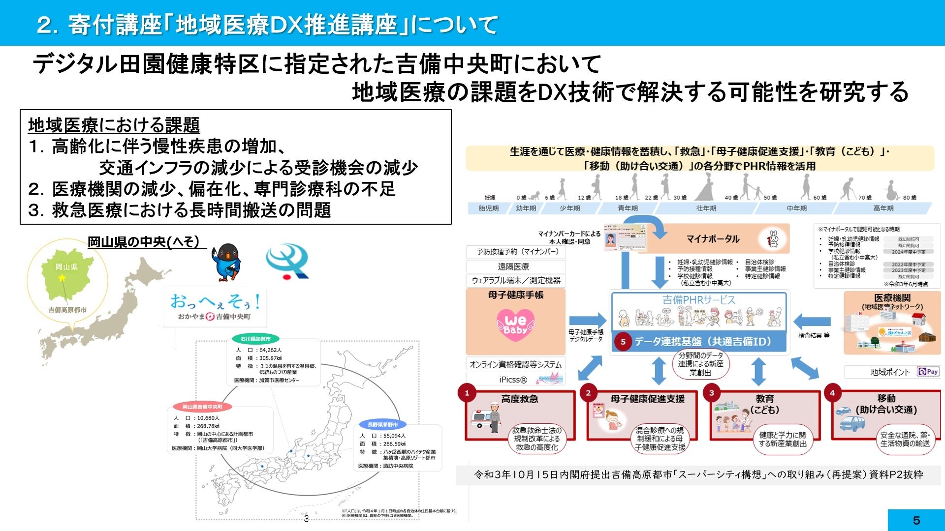 今回、これらの取り組みをさらに強力に推進するために吉備中央町から寄付講座「地域医療DX推進講座」のご提供の申し出あり、本年4月1日に講座を設置し、3年間の取り組みを開始しました。