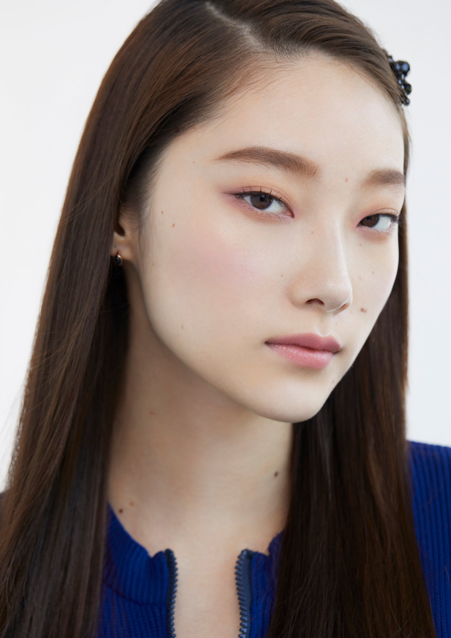 ・目もとはブラウンのアイシャドウを目頭側と目尻側を囲むようにぼかし、目の横幅を出します。明るめのベージュを黒目の上下にぼかし入れ、立体感を演出します。ブルーのアイライナーで目頭を囲むように描き、目尻側は水平気味に引くことで、目もとを引き締めながらさりげなく色を効かせます。カールしたまつ毛がセパレートするようにマスカラを塗布します。