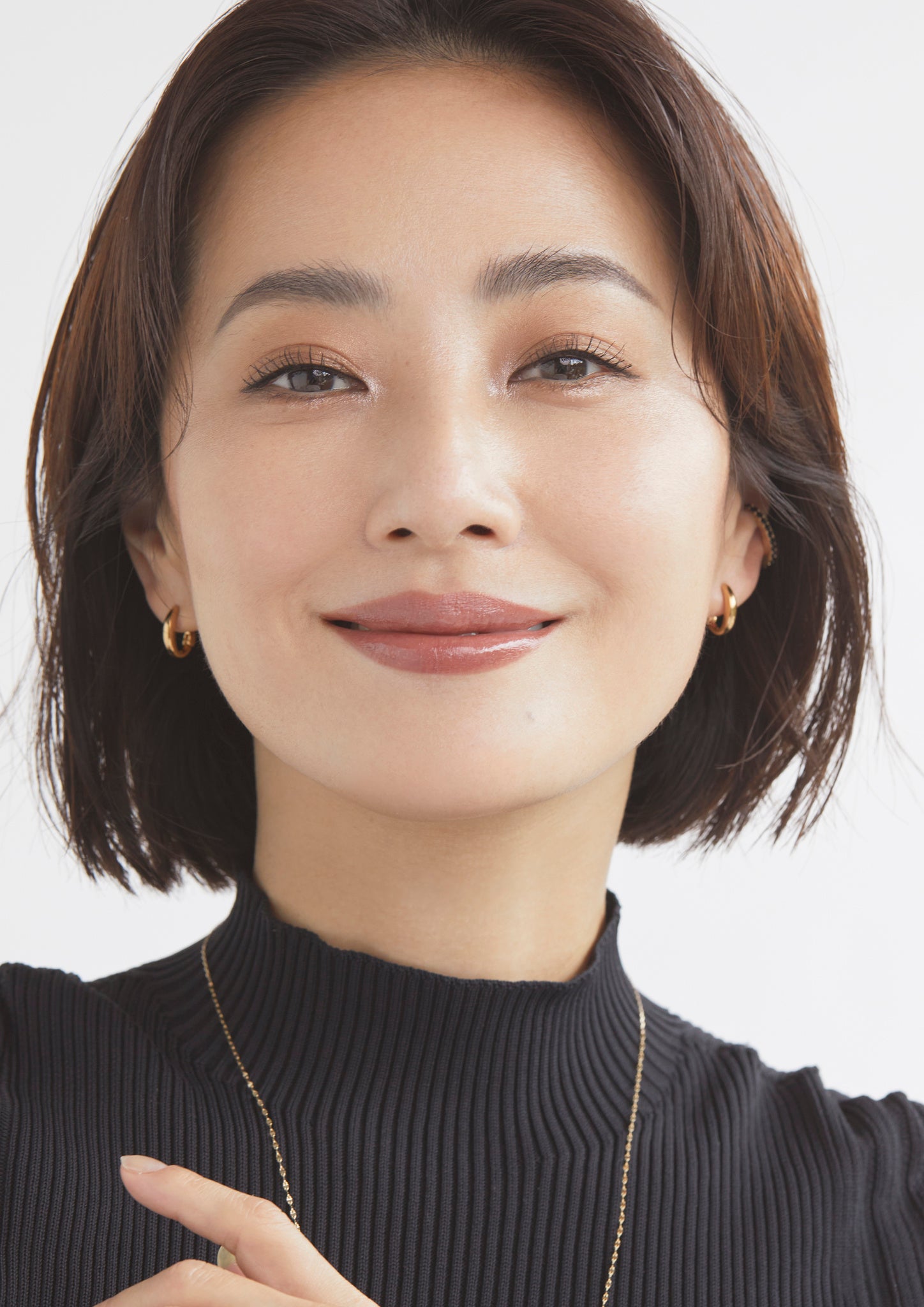 ・肌はトーンアップ効果のある下地を顔の中心に塗布。ファンデーションは普段使用している色を顔の中心をメインに、ひとつ暗めのファンデーションをフェイスラインに薄くぼかします。ブラシでパウダーを塗布し、セミマットな肌に。チークはほんのり発色する程度にぼかします。