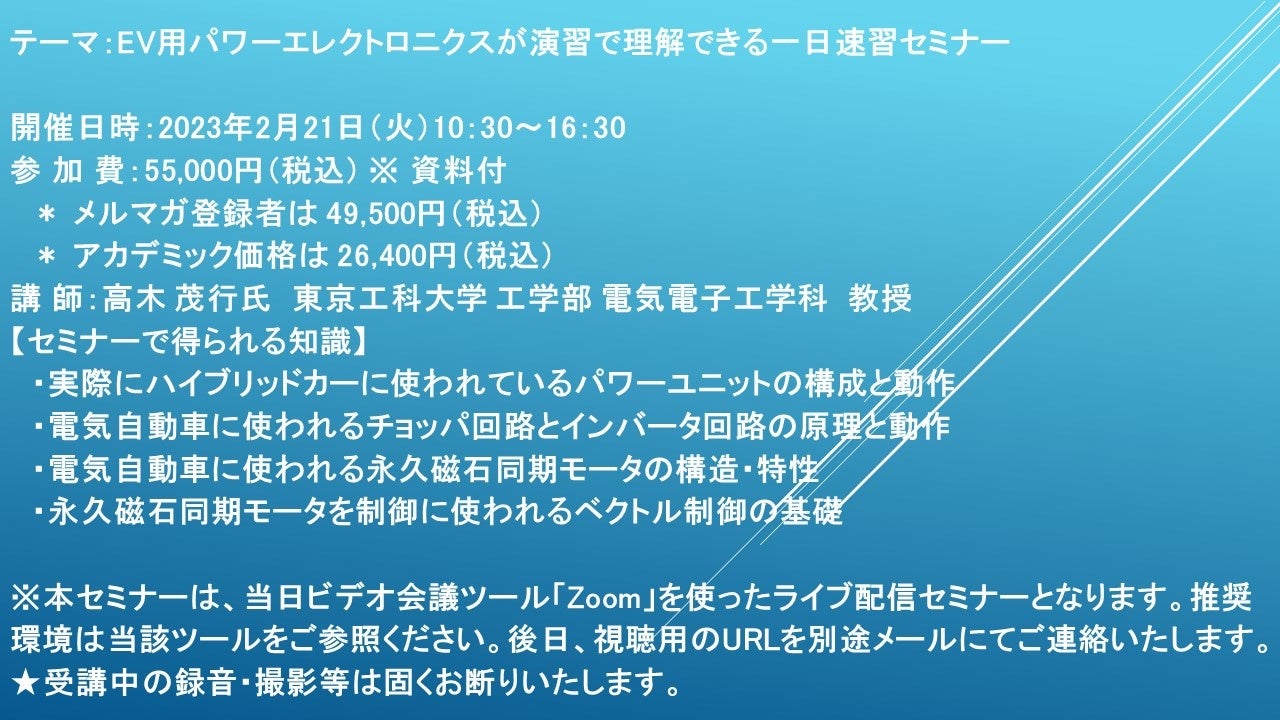 先端技術情報や市場情報を提供している(株)シーエムシー・リサーチ(千代田区神田錦町: https://cmcre.com/ )では、 各種材料・化学品などの市場動向・技術動向のセミナーや書籍発行を行っておりますが、 このたび「EV用パワーエレクトロニクスが演習で理解できる一日速習セミナー」と題するセミナーを、 講師に高木 茂行 氏 東京工科大学 工学部 電気電子工学科 教授をお迎えし、2023年2月21日(火)10:30より、 ZOOMを利用したライブ配信で開催いたします。 受講料は、 一般:55,000円、 弊社メルマガ会員:49,500円、 アカデミック価格は26,400円となっております(資料付)。